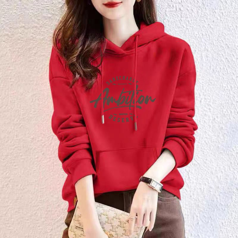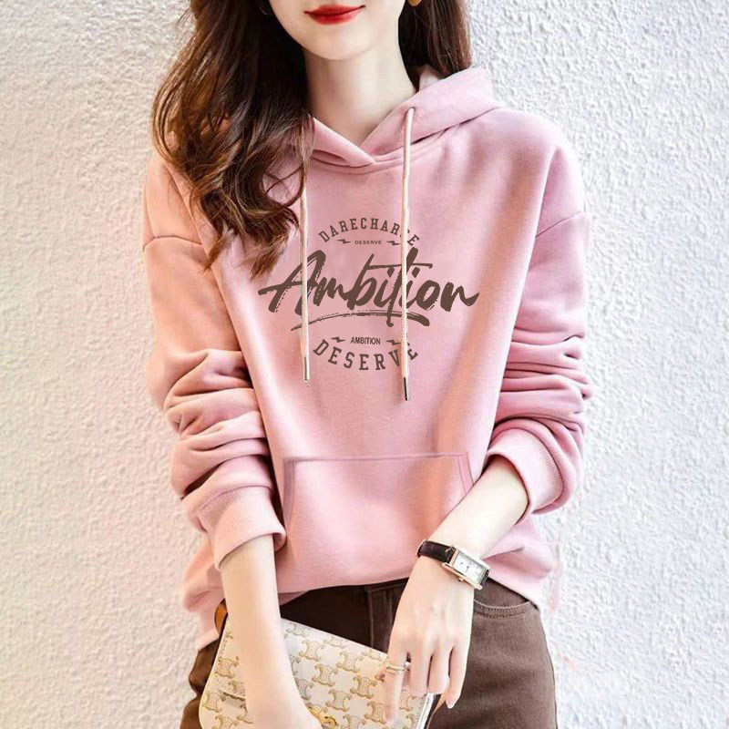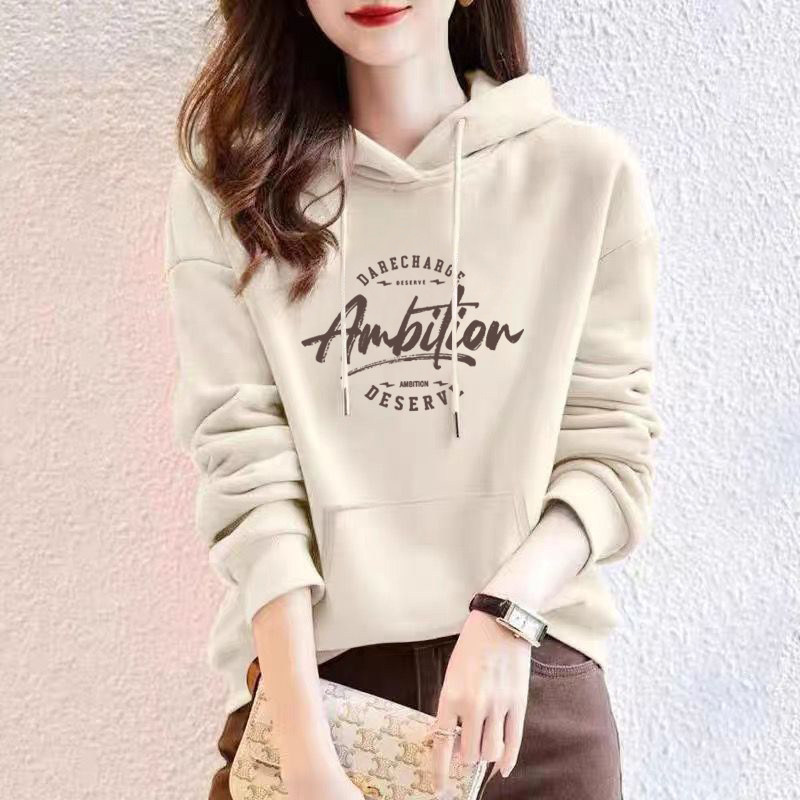 即墨纯棉连帽卫衣女秋冬装新款小个子时尚印花杏色长袖慵懒风外套