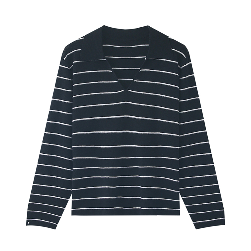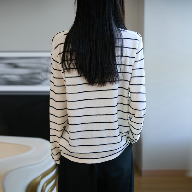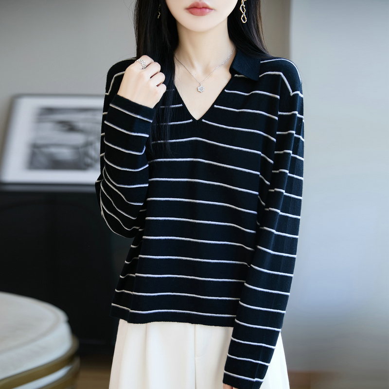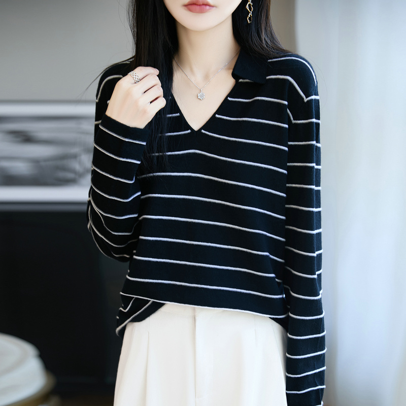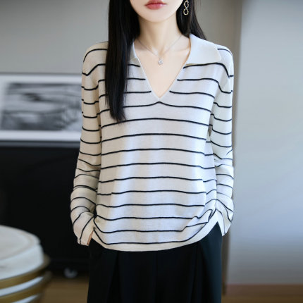 2025春秋新款100%纯羊毛衫女V领长袖针织衫宽松条纹百搭打底上衣