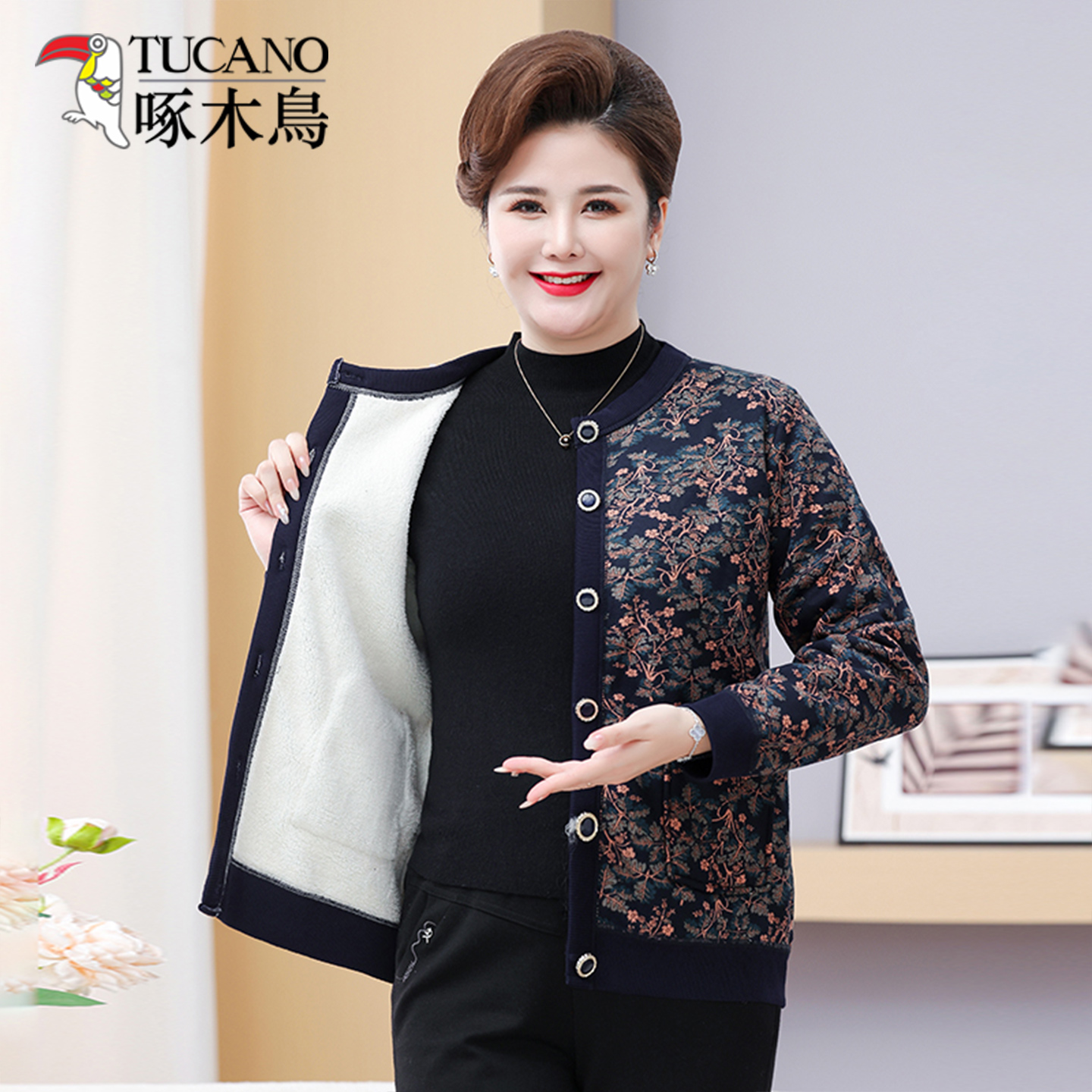 啄木鸟2025年秋冬新款加绒外套中老年人奶奶保暖衣妈妈装毛衣外套