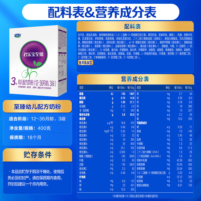 君乐宝至臻3段幼儿配方奶粉12-36个月CPP OPO400g*3盒