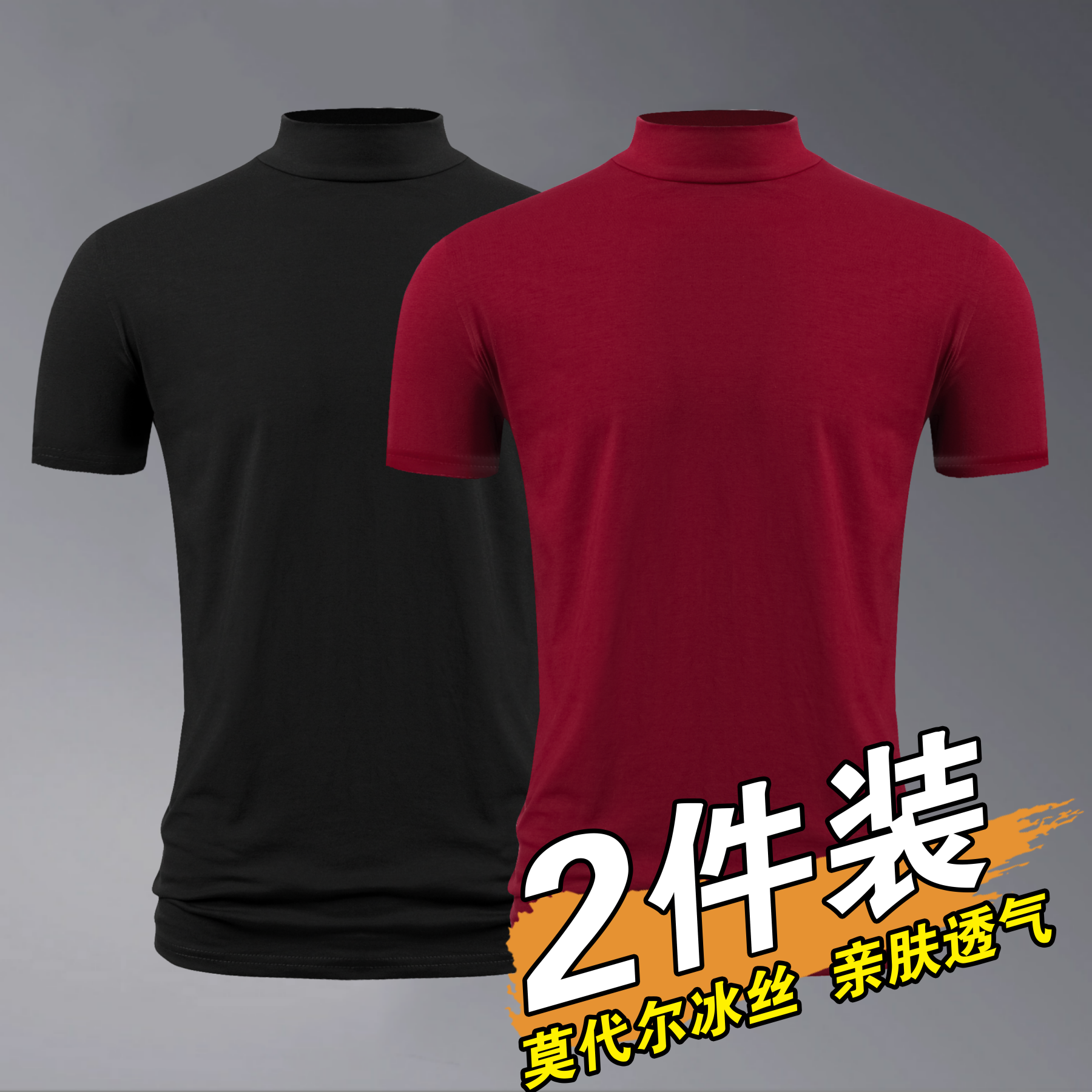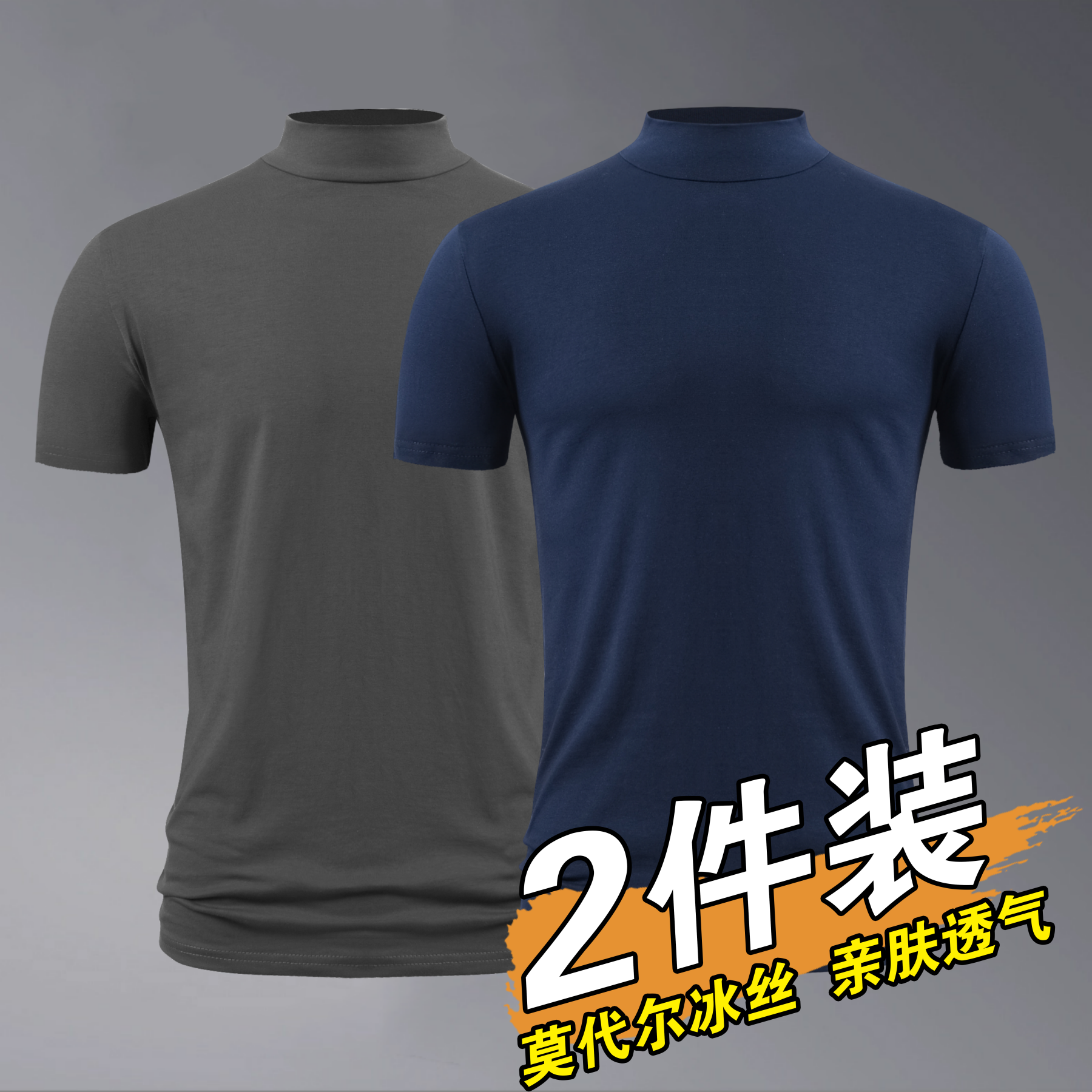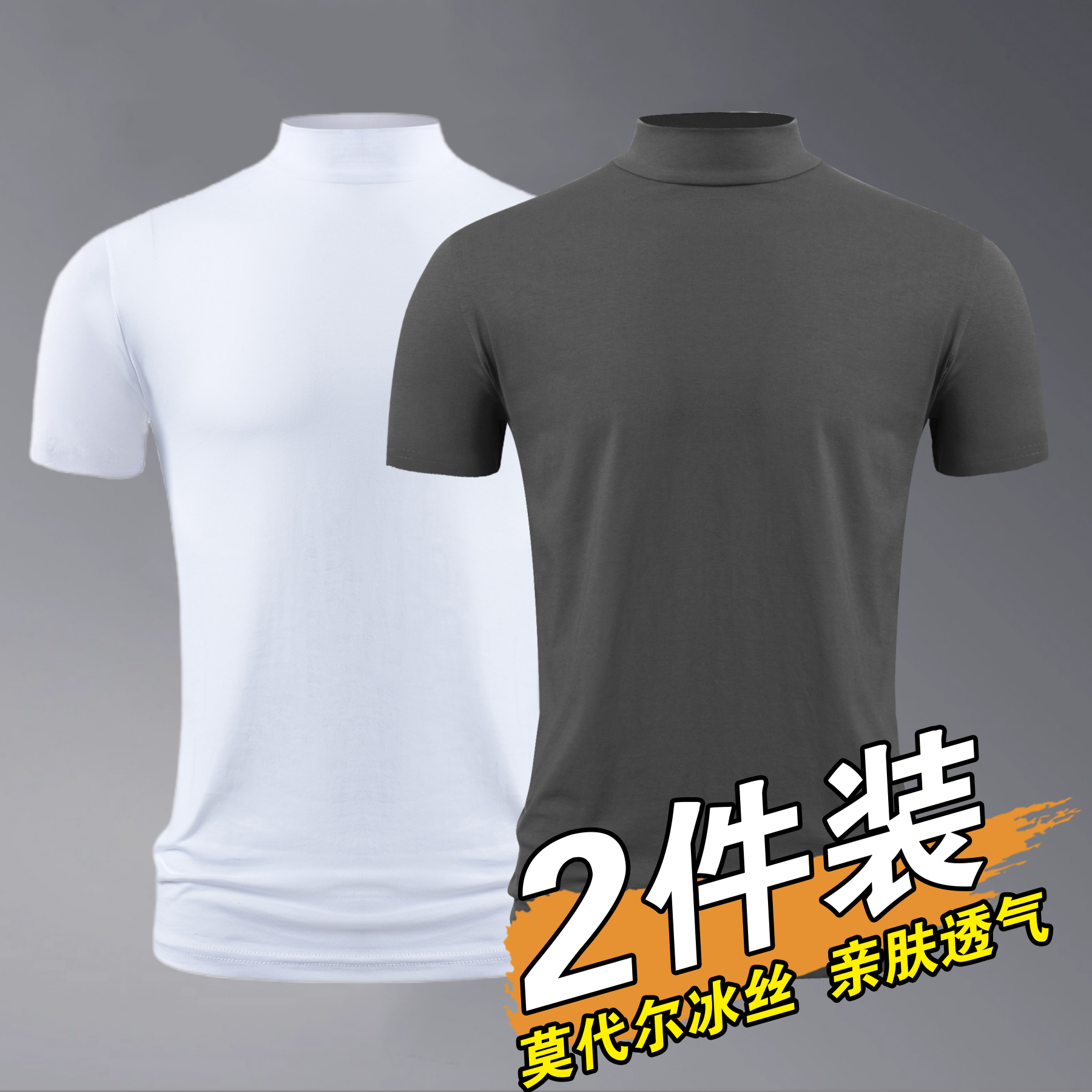 半高领短袖男t恤丝光棉半袖薄款春夏打底衫修身潮莫代尔中领体恤