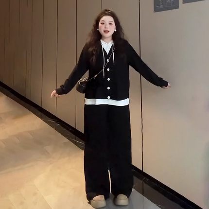 200大码胖mm秋季套装女假两件上衣高腰阔腿休闲裤子巨显瘦两件套