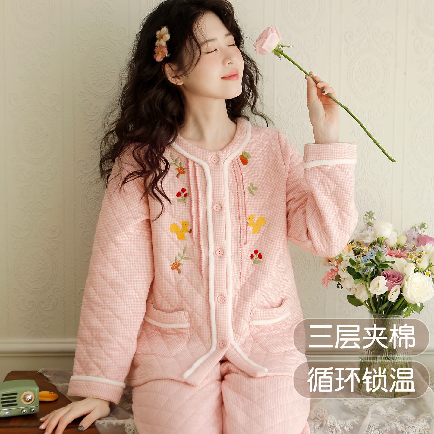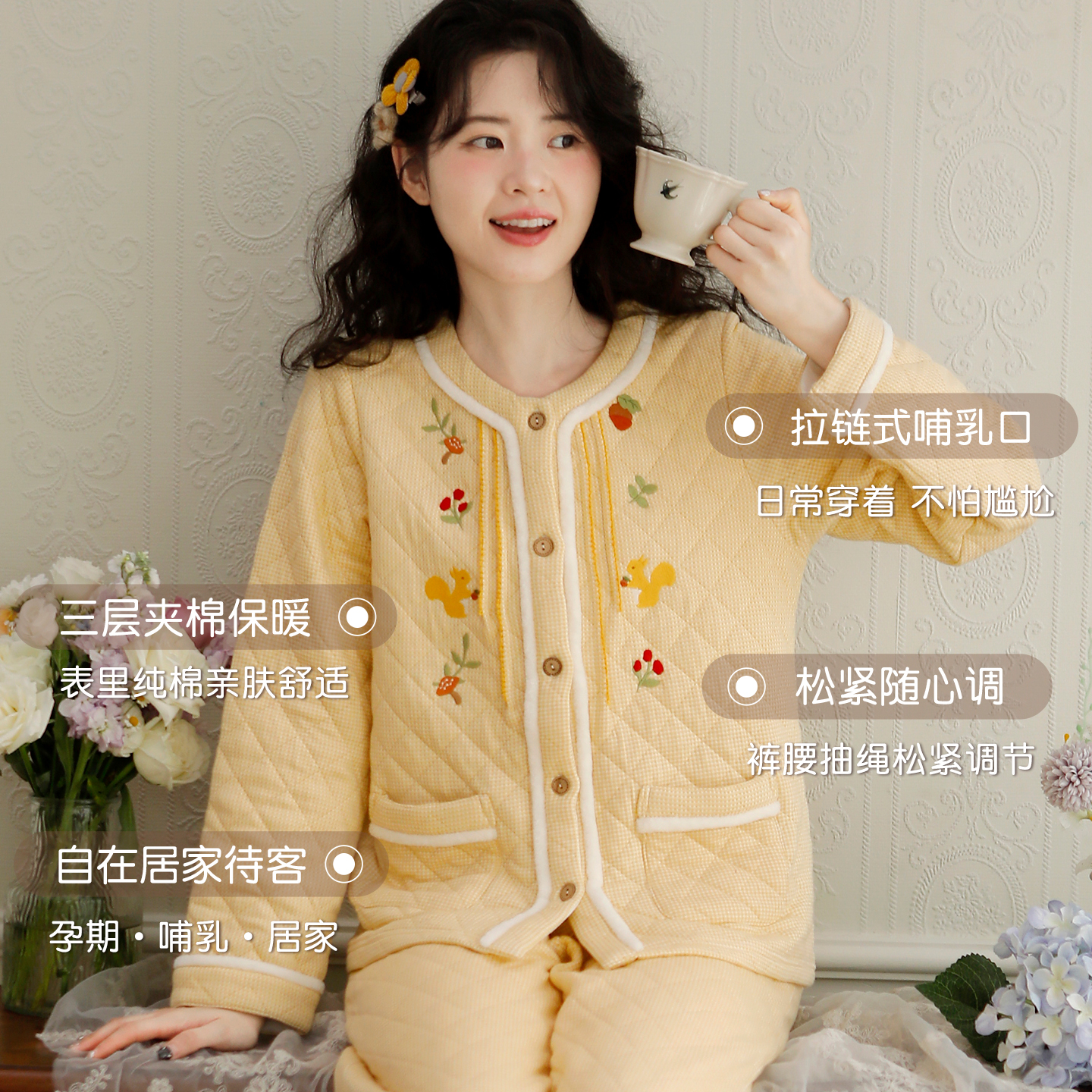 富朵纯棉秋冬季空气棉夹层月子服保暖孕妇产后哺乳睡衣加厚可外穿