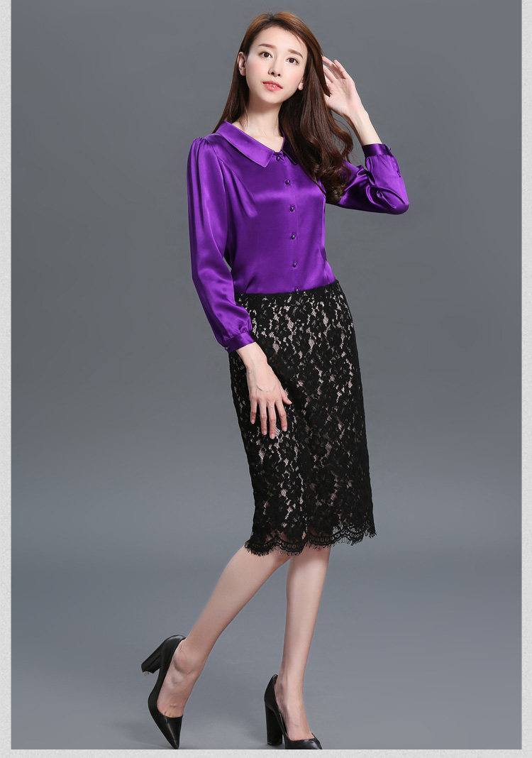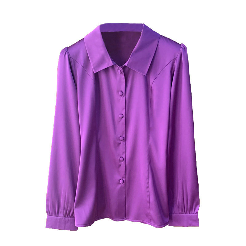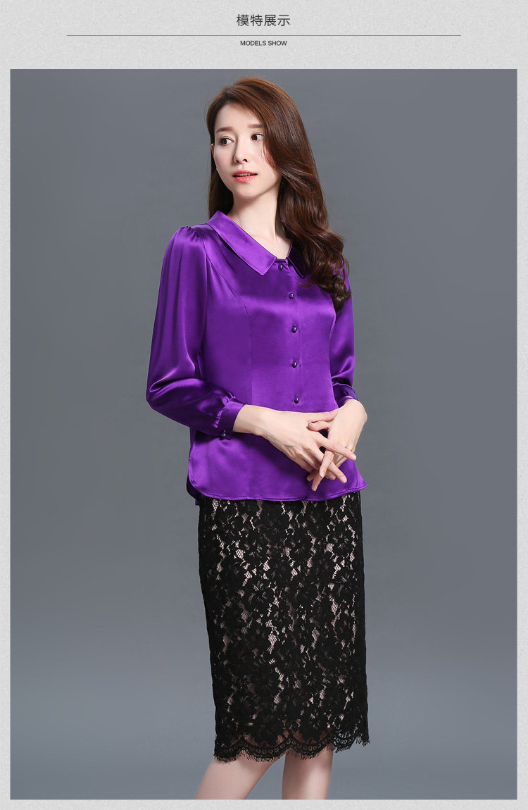 春秋新款女桑蚕丝上衣纯色紫色真丝衬衫娃娃领衬衣长袖修身女装