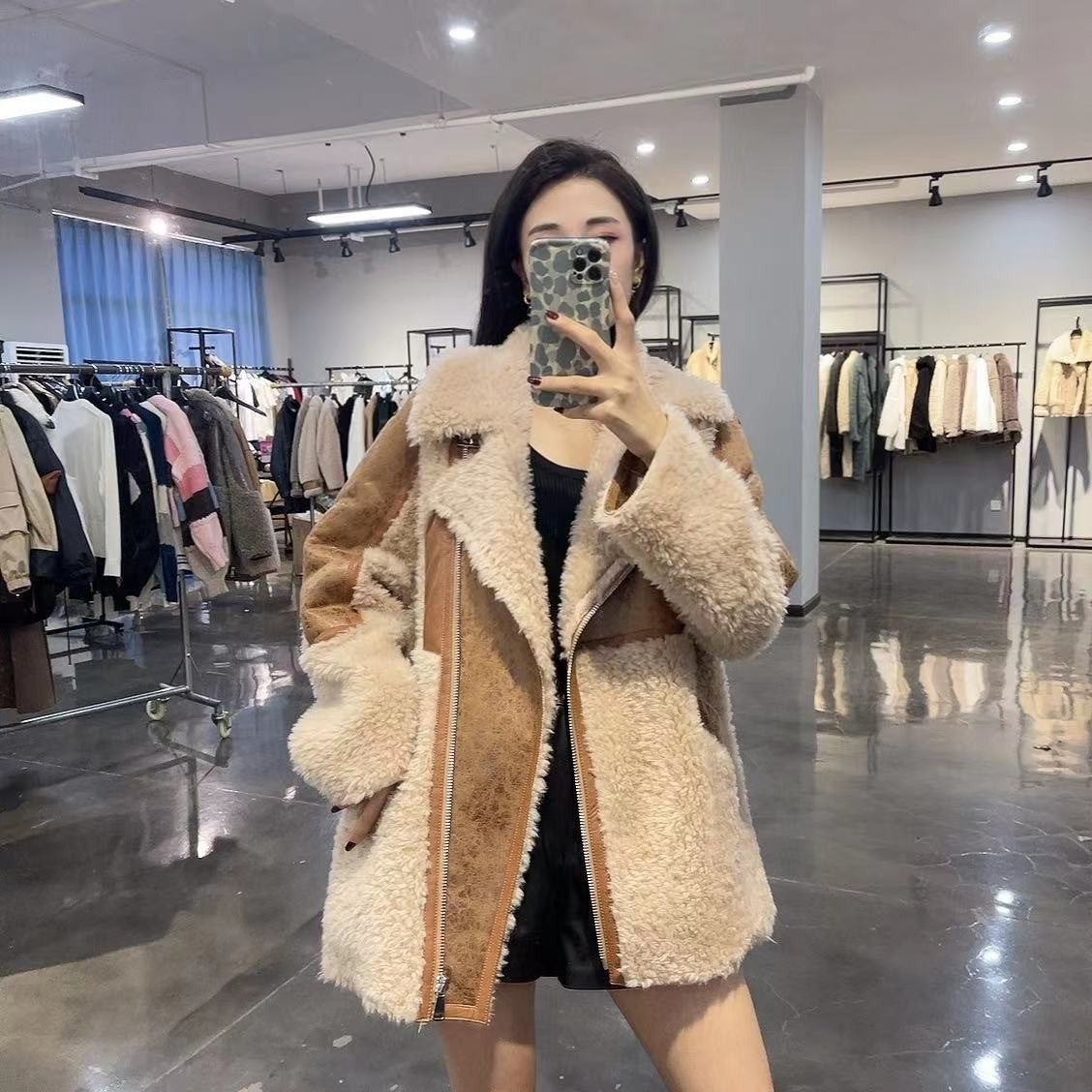 海宁新款颗粒羊剪绒大衣皮毛一体澳洲羊羔毛短款撞色皮草外套女冬