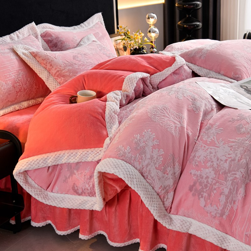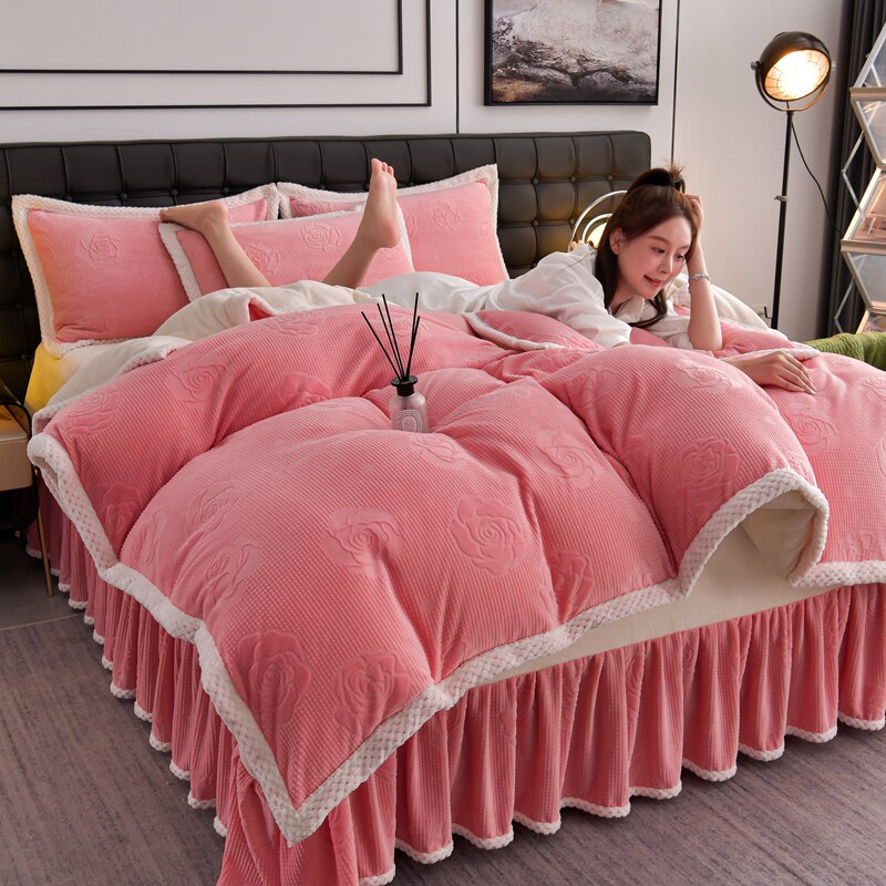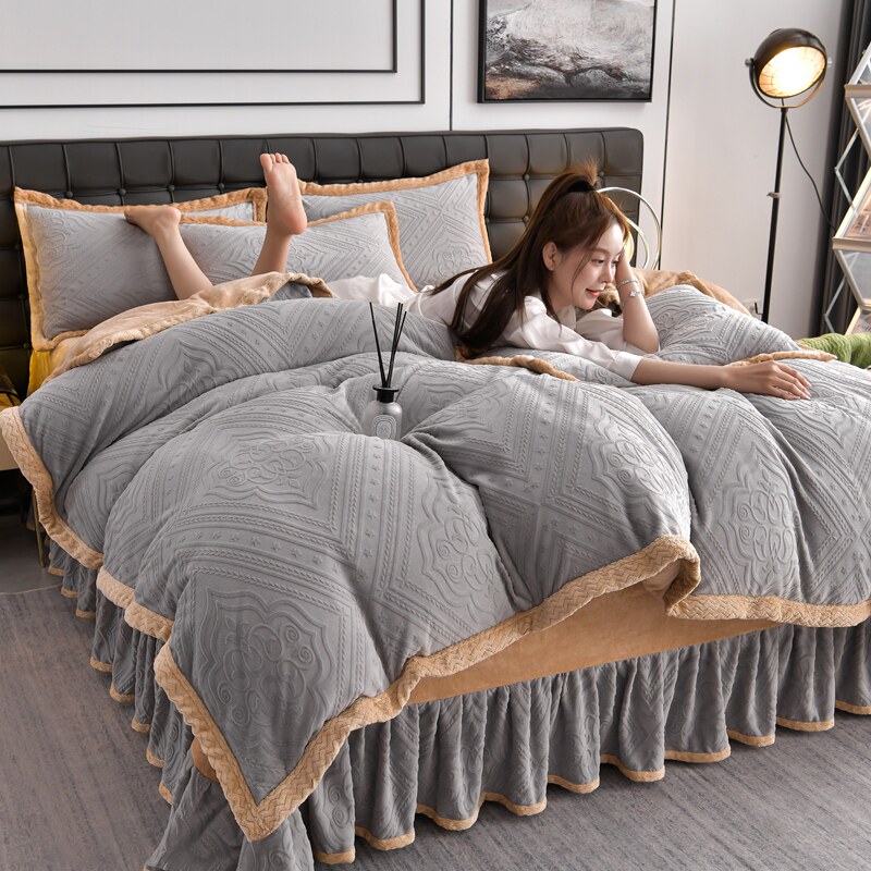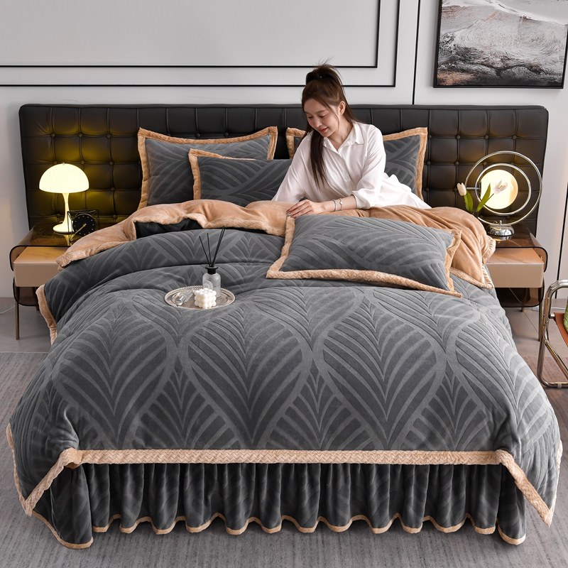 雕花牛奶绒四件套加厚冬季2025新款高级感双面珊瑚绒被套床单裙式
