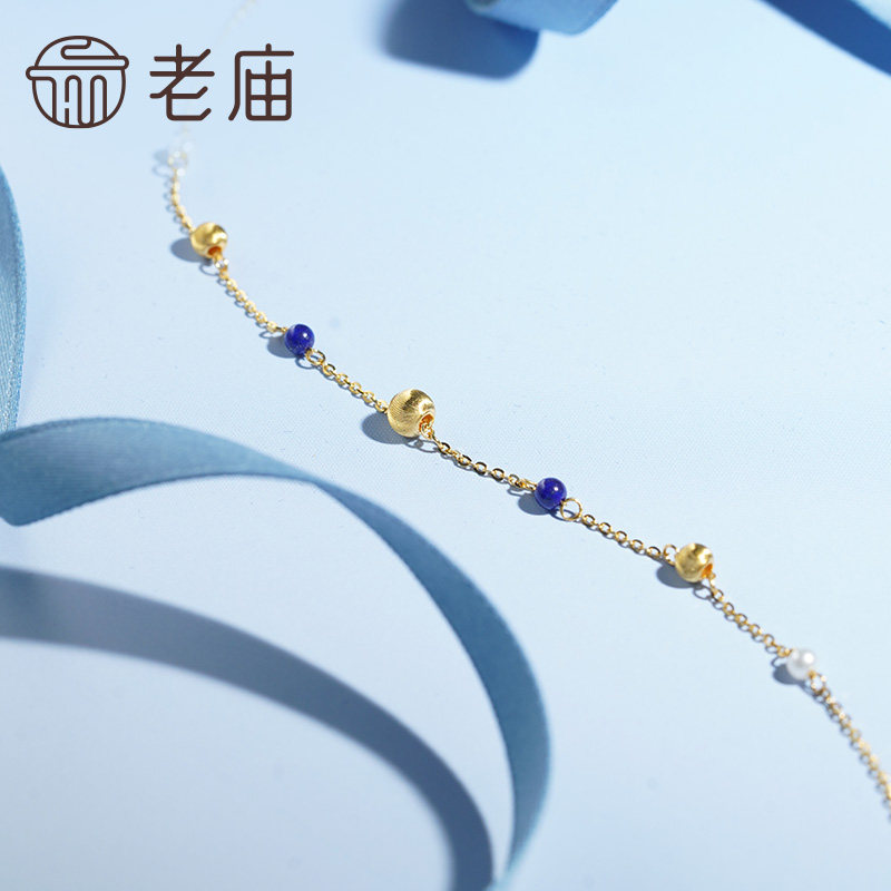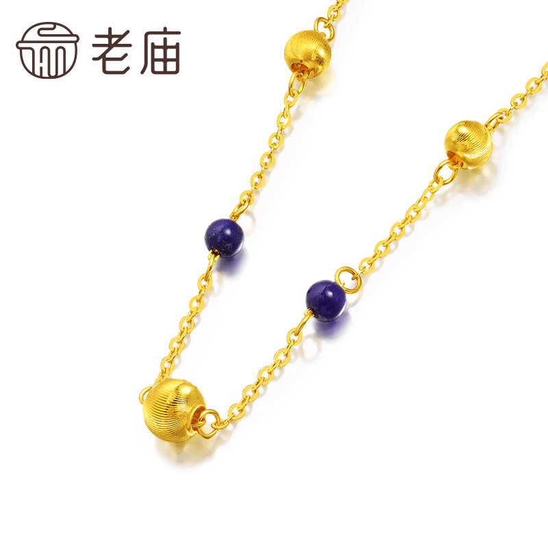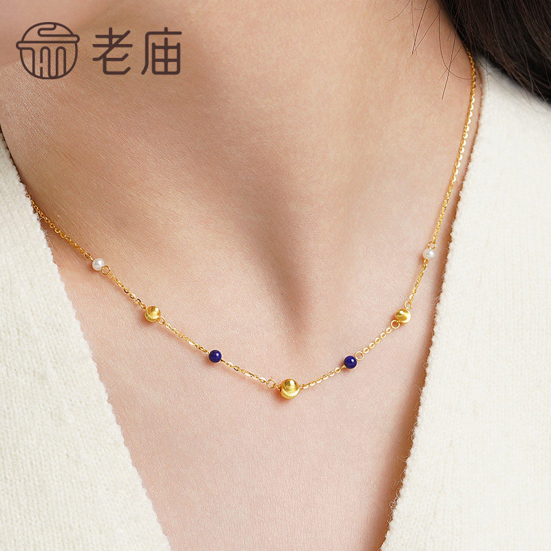 老庙黄金足金猫眼石金珠项链5G圆润精致克莱因蓝东方审美熠熠生辉