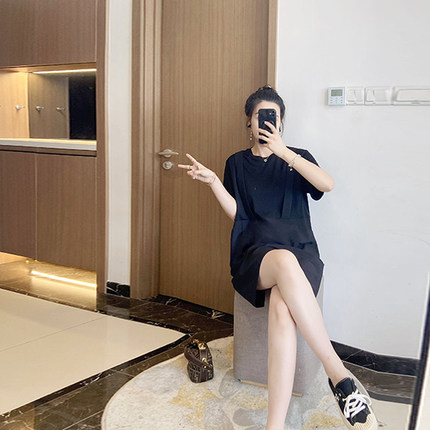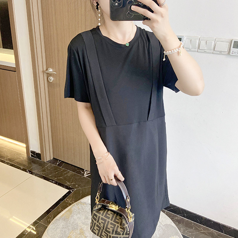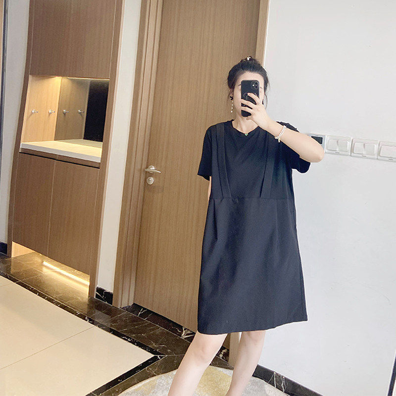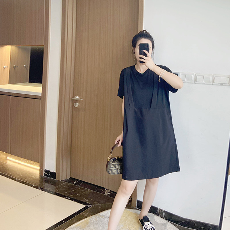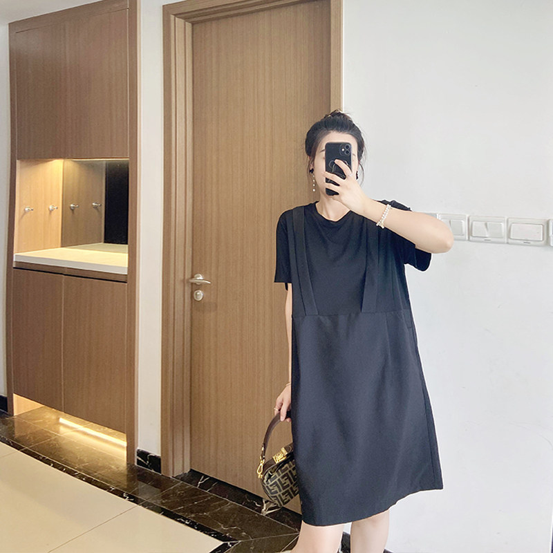 假两件拼接背带黑色显瘦大码女装2023新款夏季遮肚子连衣裙洋气
