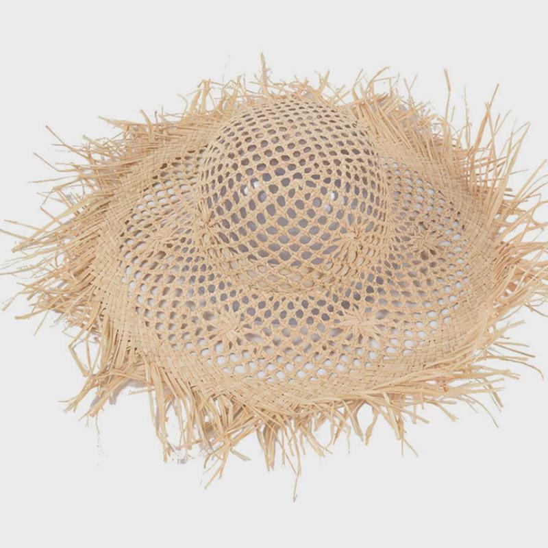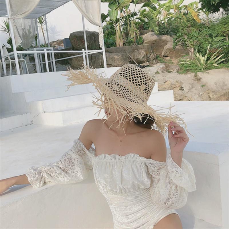 夏季草帽镂空女新款沙滩帽拍照太阳帽女大檐休闲纯色毛边拉菲草帽