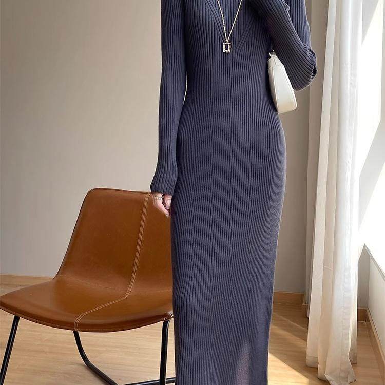 法式复古针织连衣裙女秋季新款气质修身显瘦内搭打底毛衣超长裙子