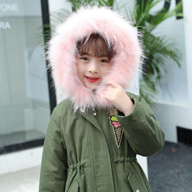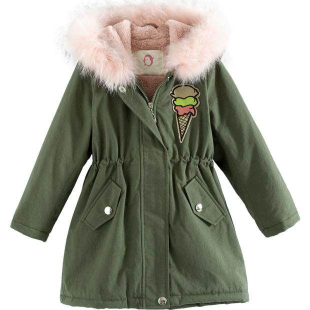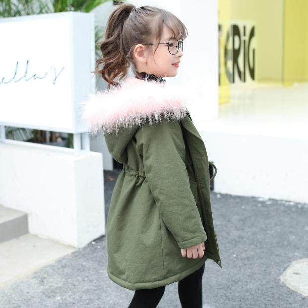 童装女童中长款加厚棉衣韩版儿童棉服军绿色毛领羊羔绒外套