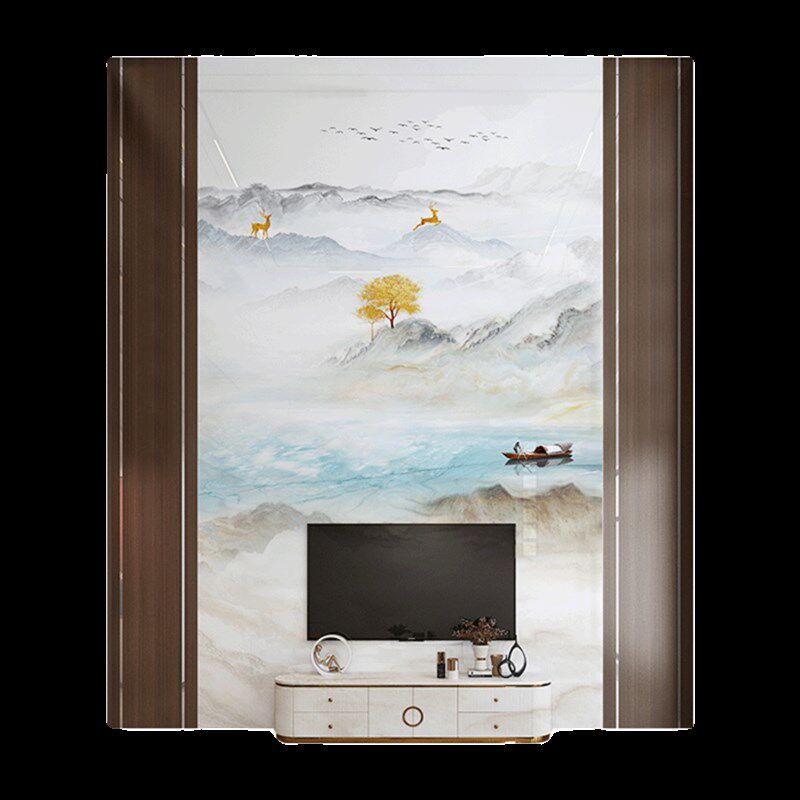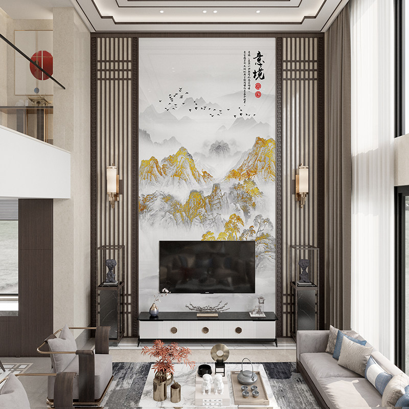 新中式别墅岩板背景墙复式客厅挑高瓷砖电视墙中空木格栅造型实木