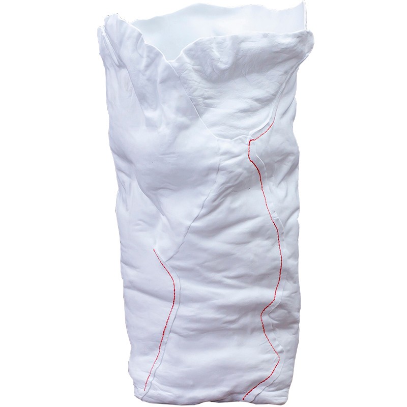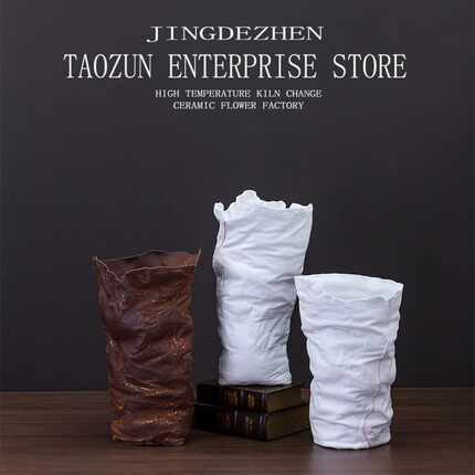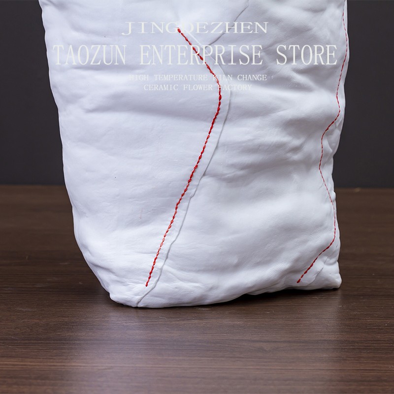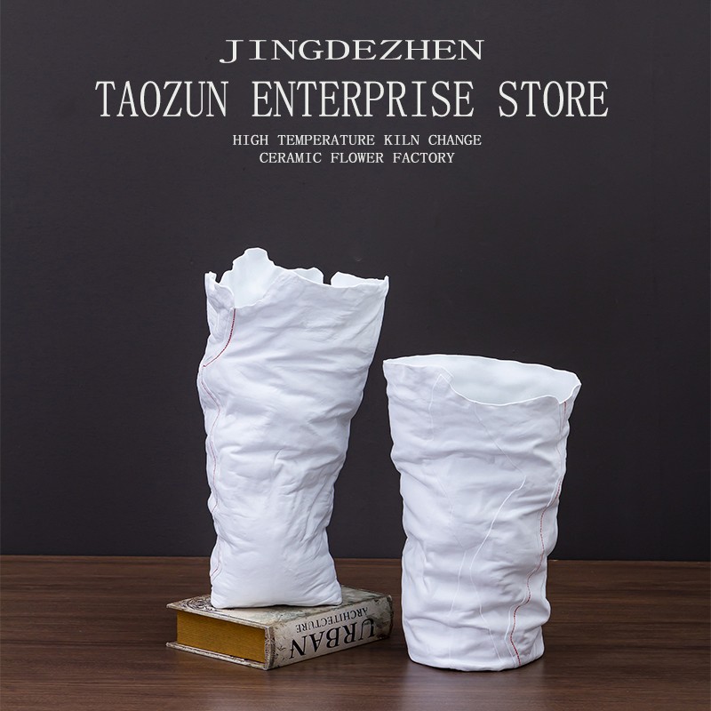 意式极简仿皮布袋l软装样板房工艺品玄关白色陶瓷褶皱大口花瓶花