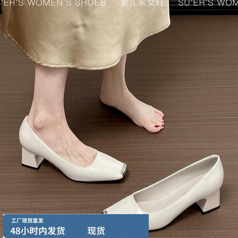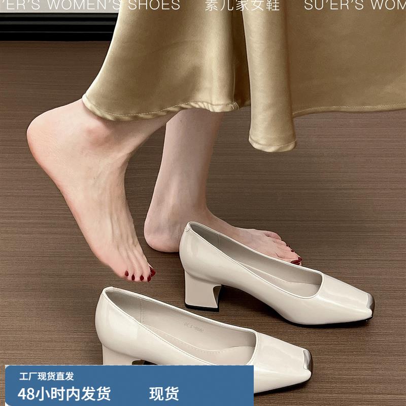 羊皮版~ 法式方头单鞋女中跟简约百搭职业通勤风气质粗跟高跟鞋女