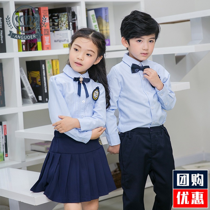 小学生浅蓝校服套装英伦学院蓝色长袖衬衣藏蓝西裤男女童班服春秋