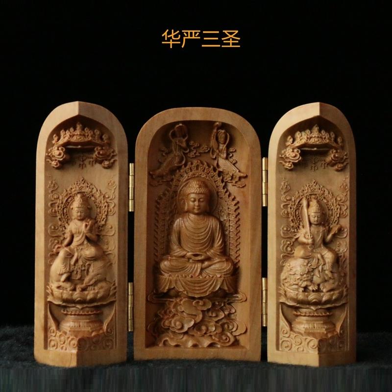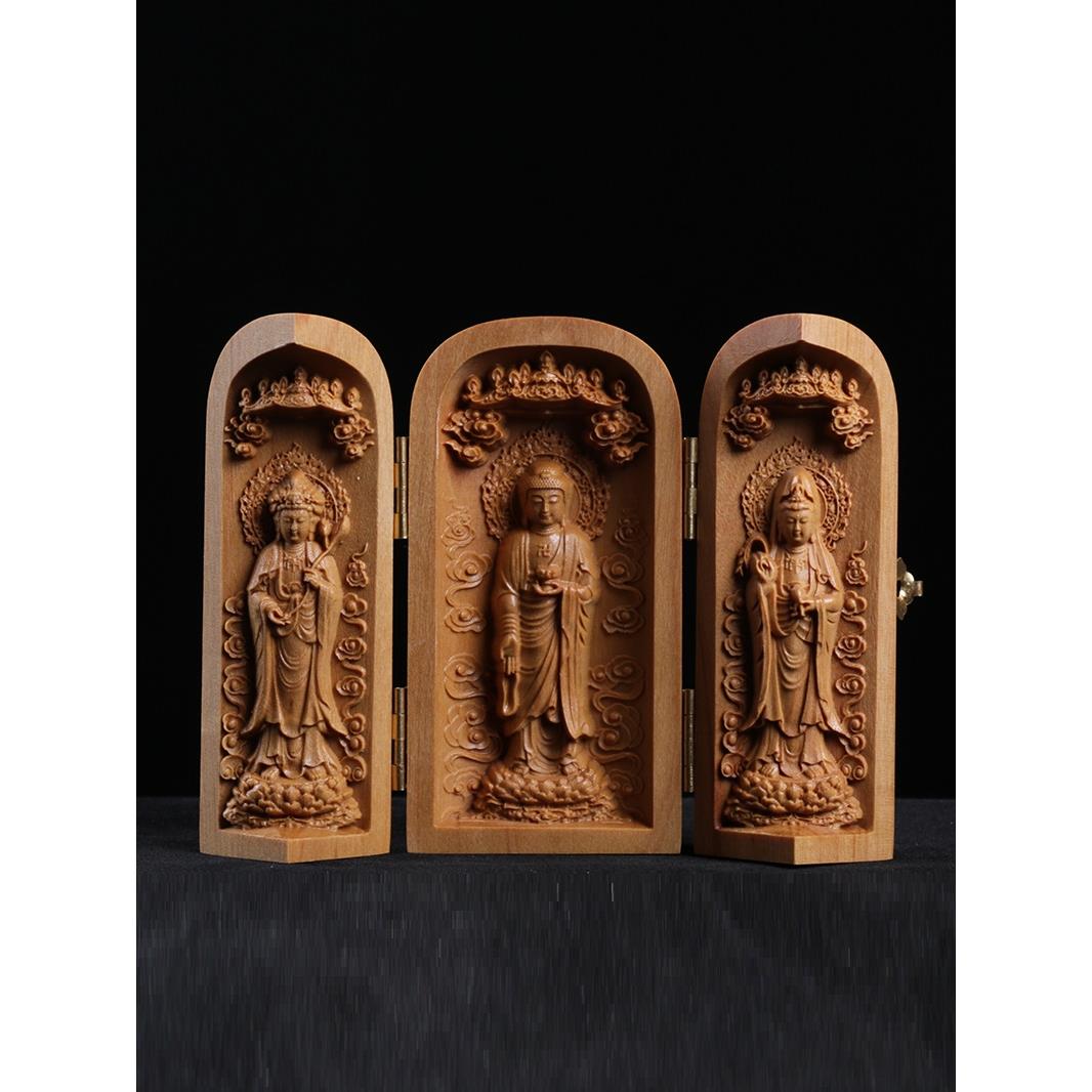 柚木檀香木居家中式木雕摆件随身佛龛佛像菩萨西方三圣观音三开盒