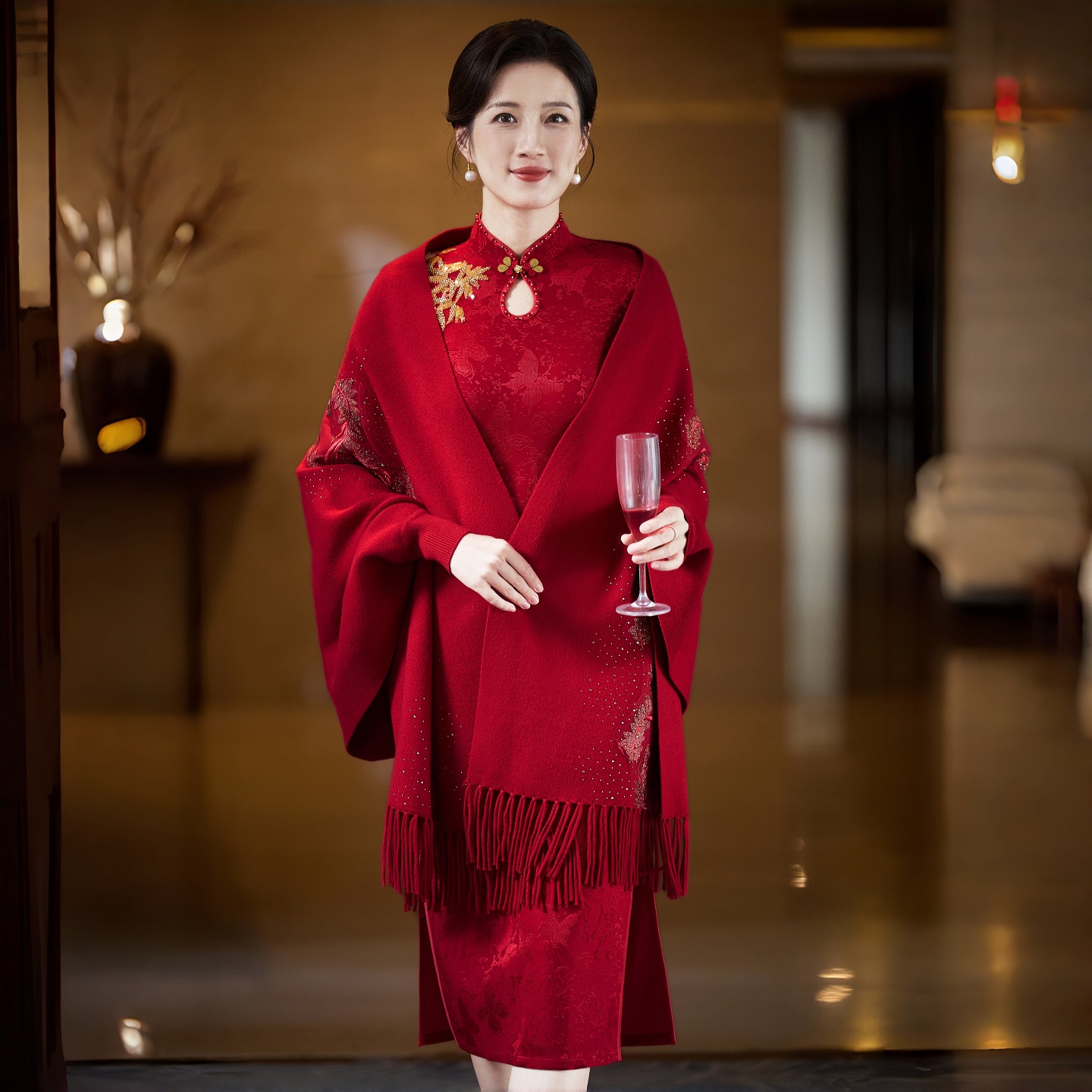 2025新款配旗袍披肩秋冬季婚宴喜婆婆妈妈礼服外套外搭红色女披肩