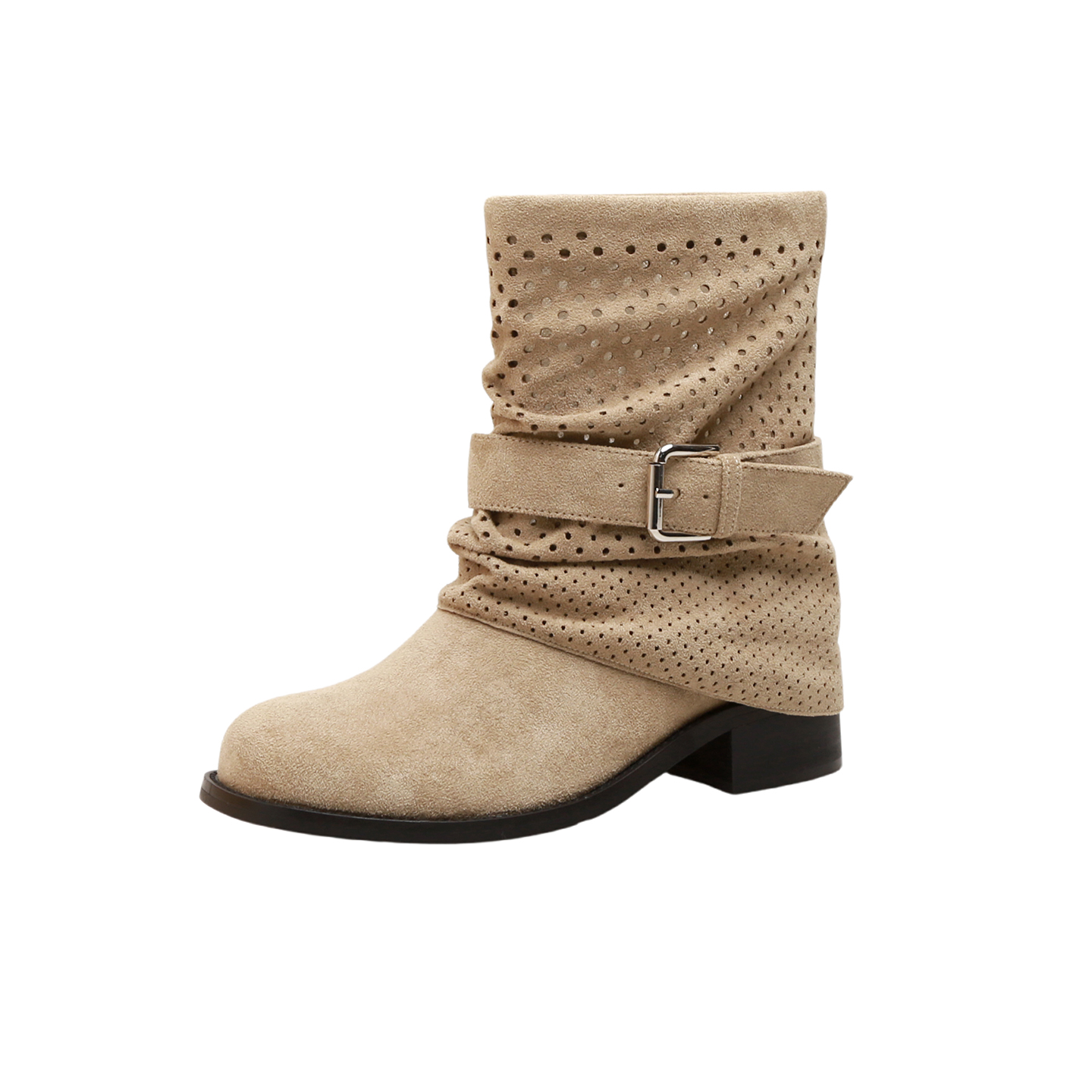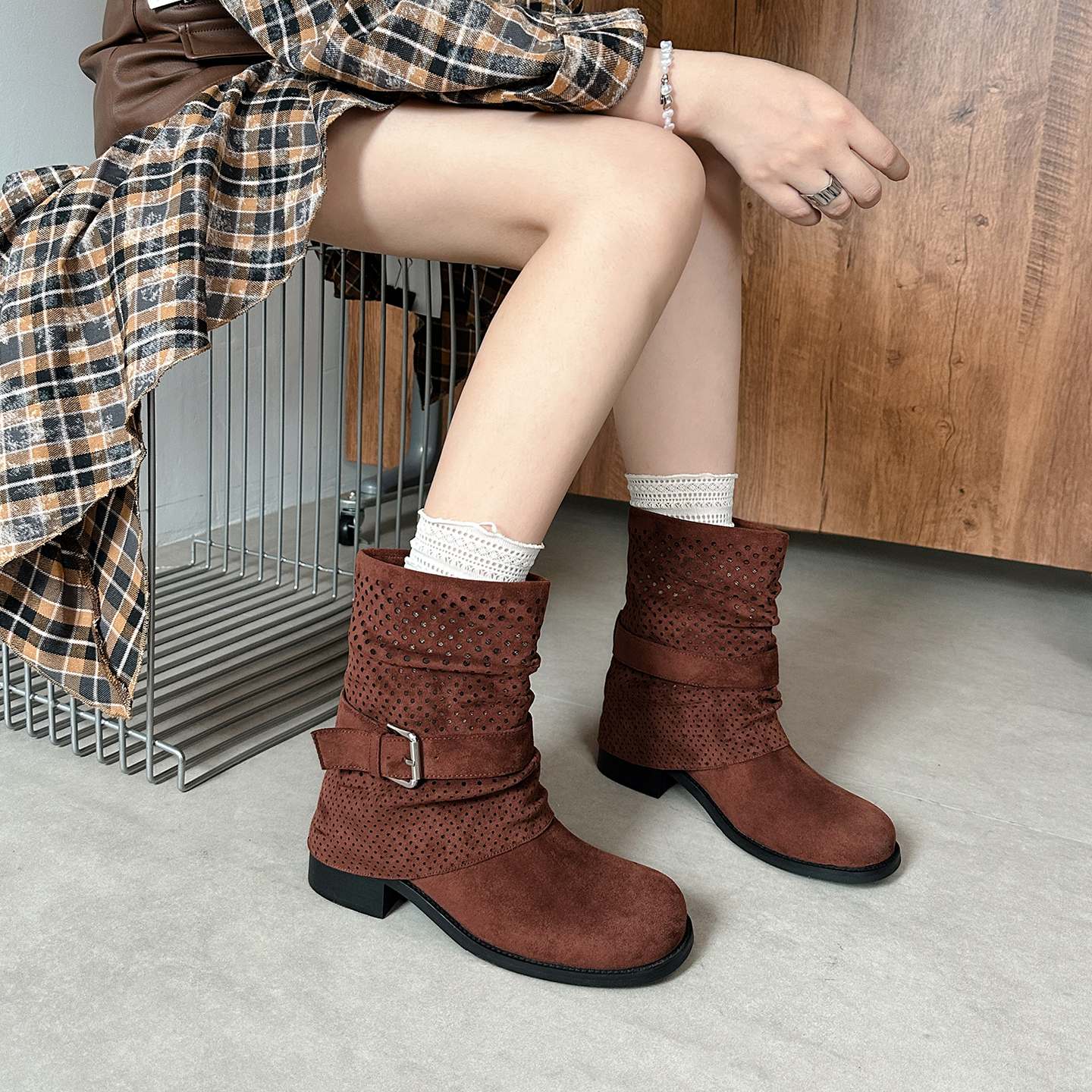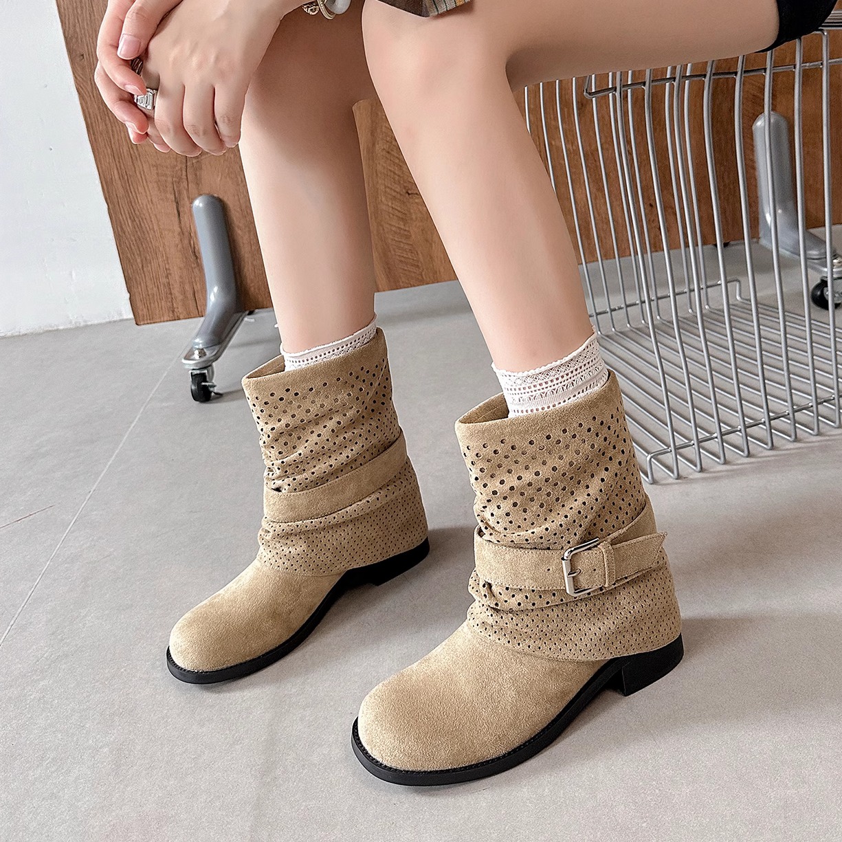 真皮版~辣妹废土风秋季短靴女西部靴褶皱镂空堆堆靴中筒机车靴