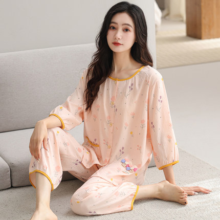 夏季七分袖睡衣套装女士云朵碎花春秋天大码家居服薄款宽松可外穿