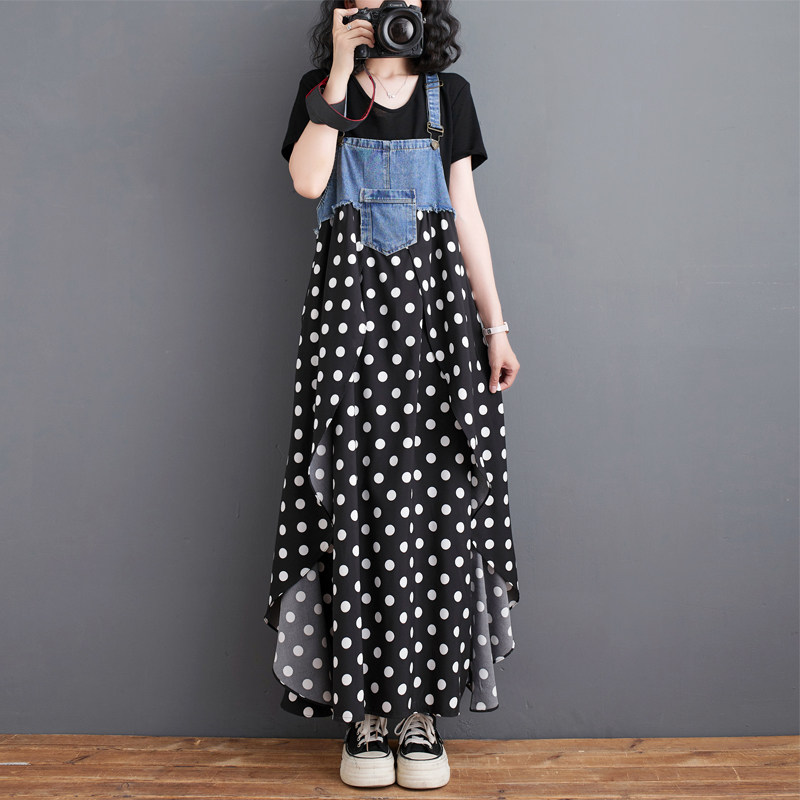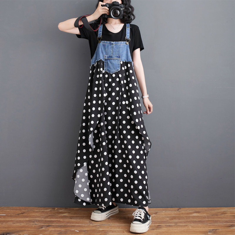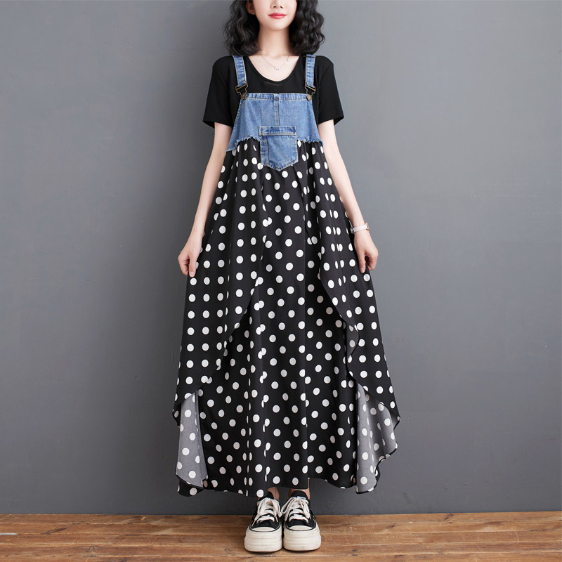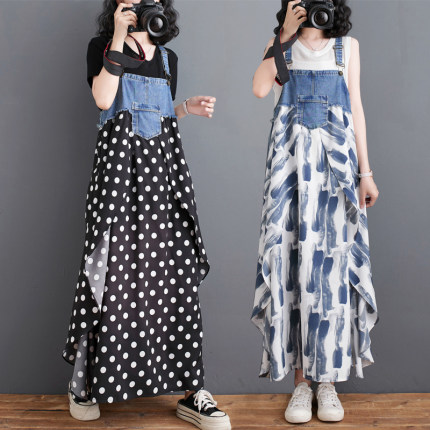 夏装新款荷叶边宽松雪纺印花牛仔设计感背带中长款连衣裙子高腰
