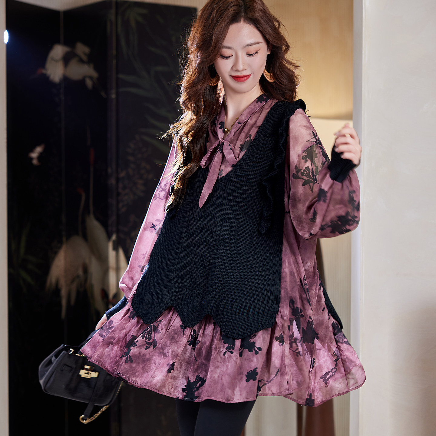 宝诗黎假两件拼接印花衬衫2026春季洋气宽松大码休闲时尚衬衣女