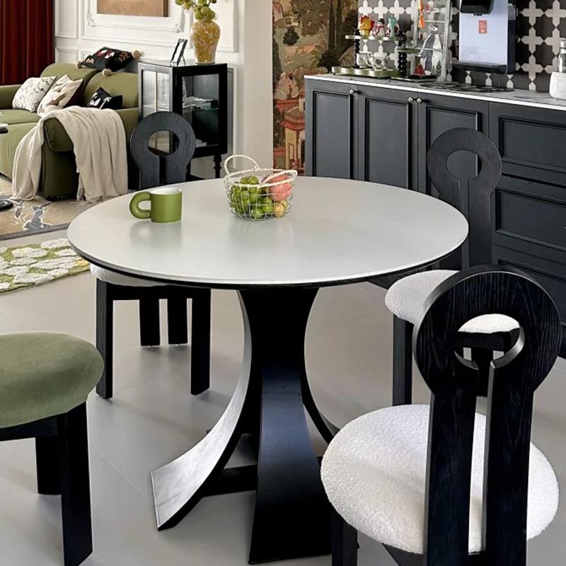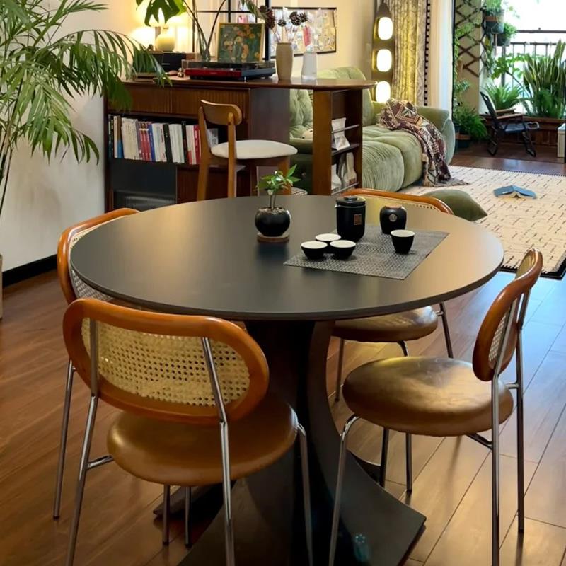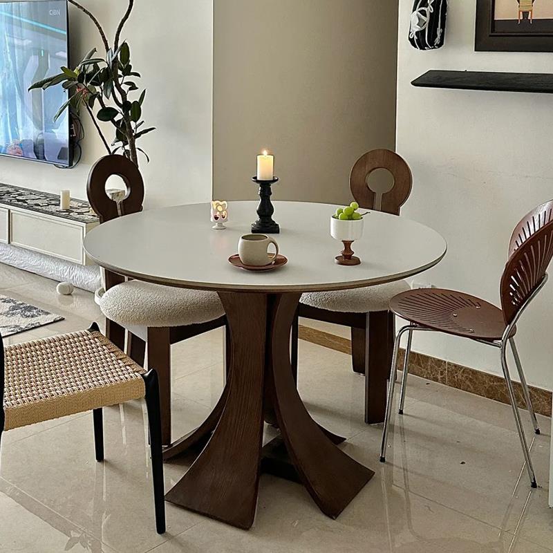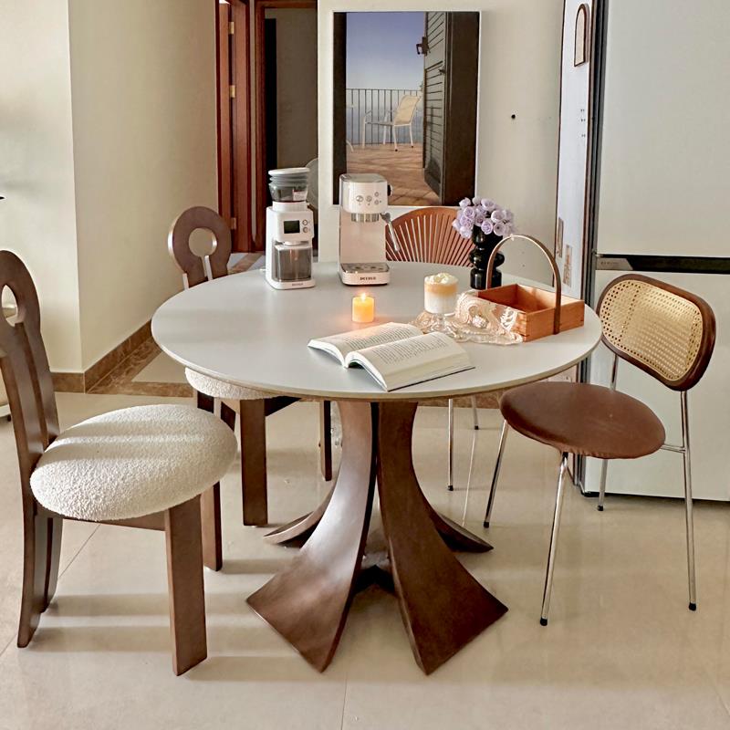 中古风北欧复古实木岩板圆形餐桌椅组合家用现代简约侘寂高端饭桌
