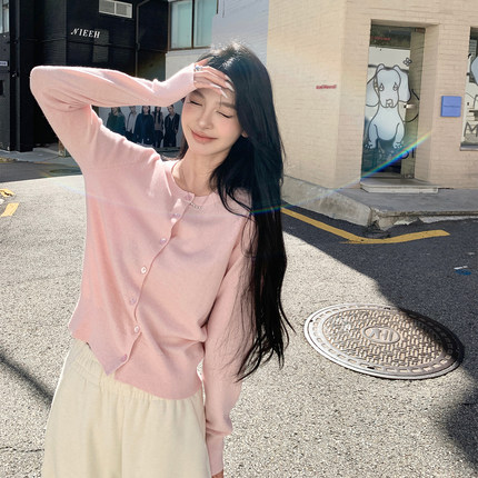 alex stevens巨好看早春羊毛上衣粉色圆领针织开衫女修身长袖短款