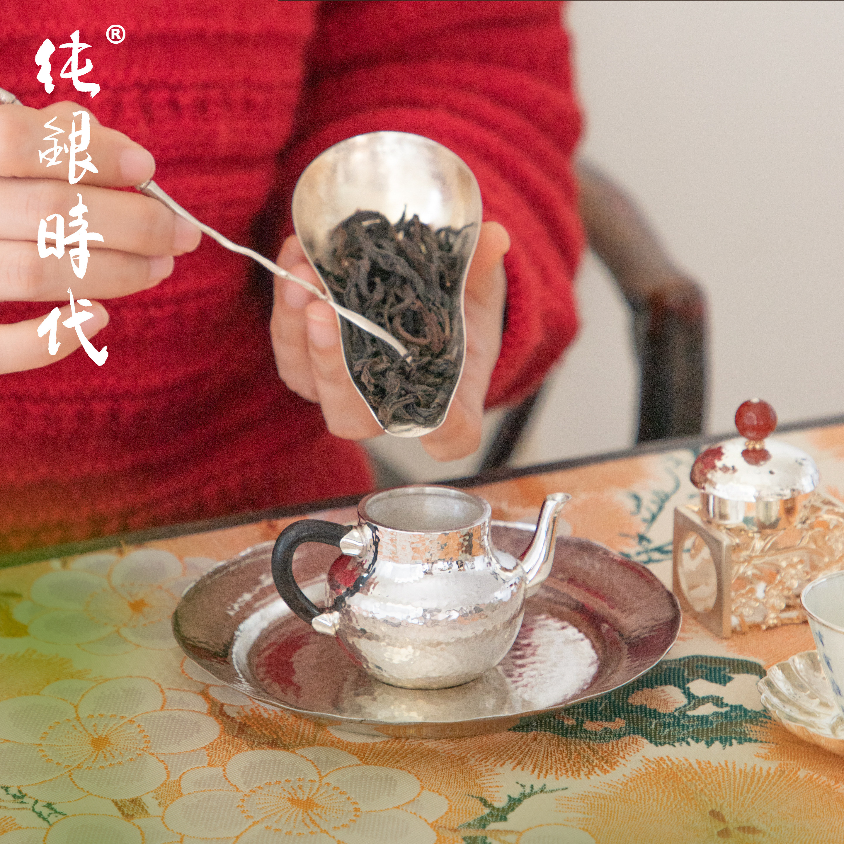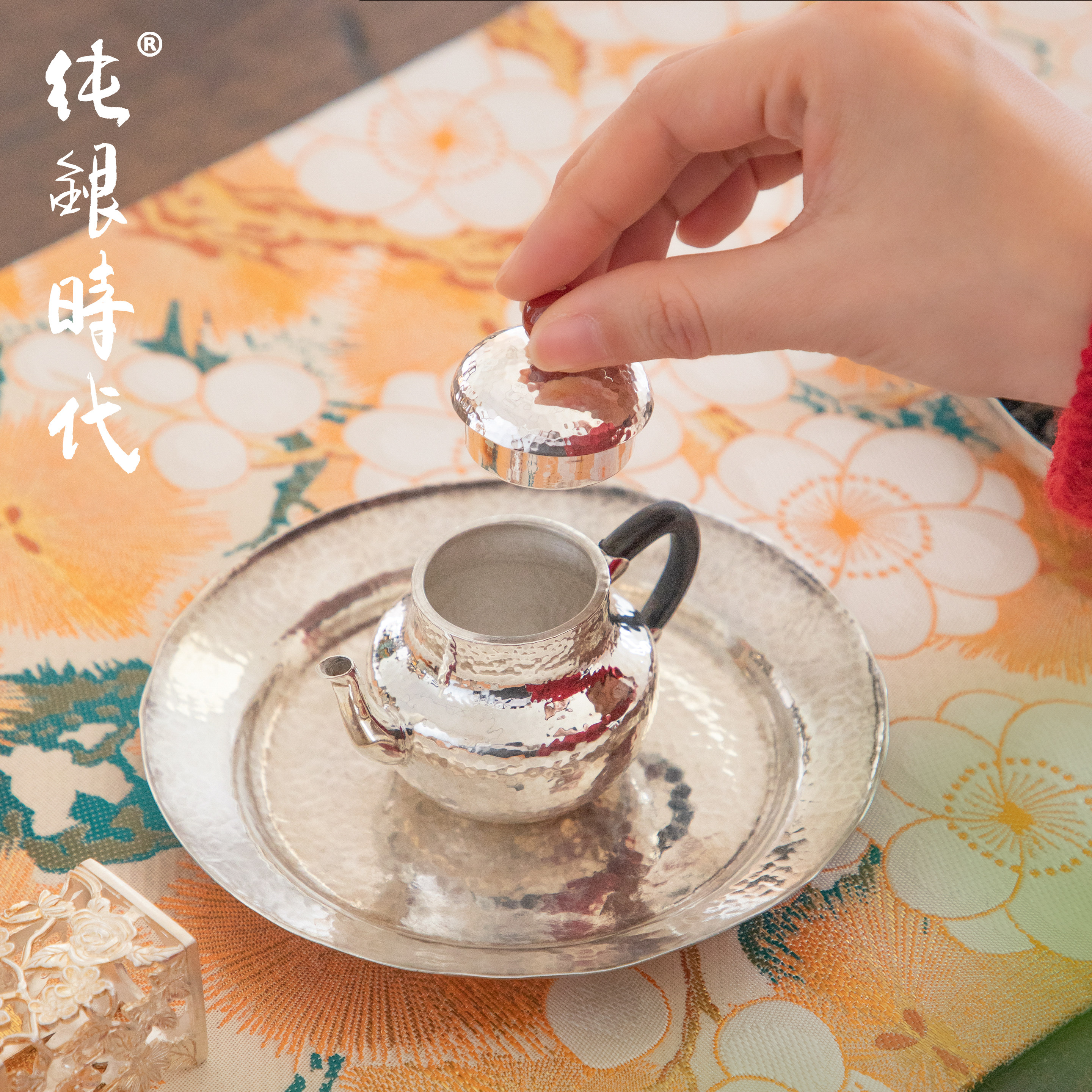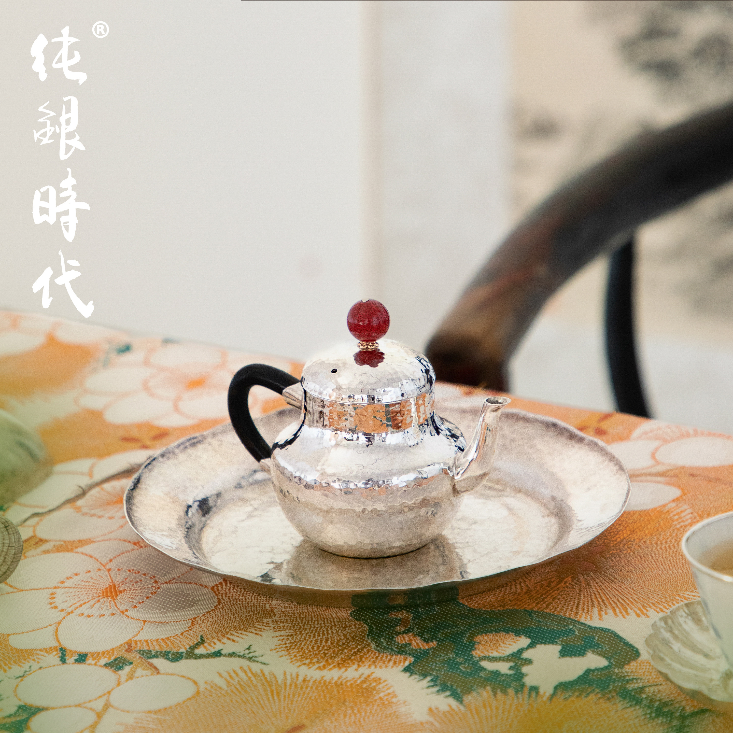 纯银时代 小思亭红玛瑙摘泡茶壶纯银999手工锤纹简约小巧银壶60ml