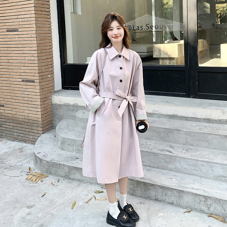 女装/女士精品风衣2025年春季纯色方领单排扣长袖棉100%