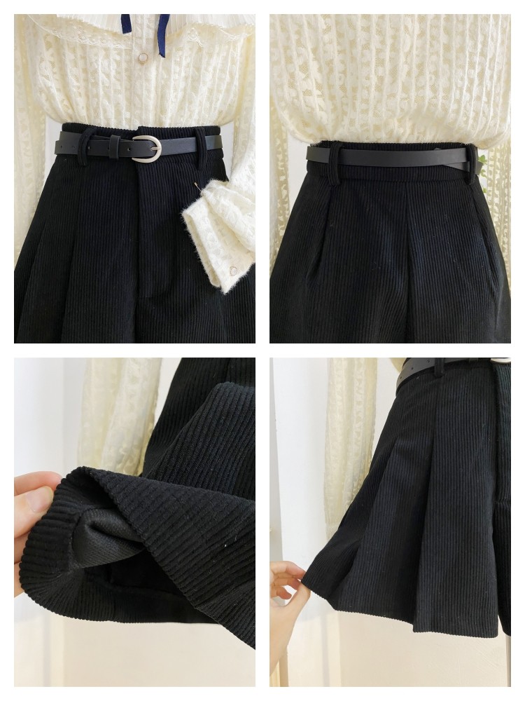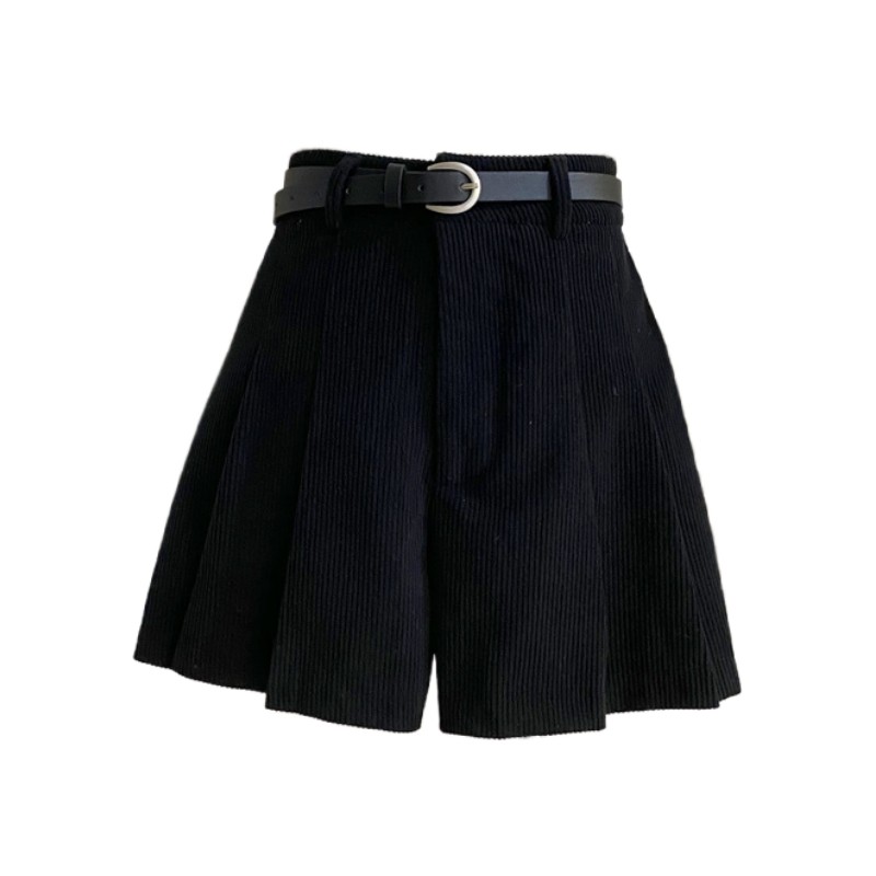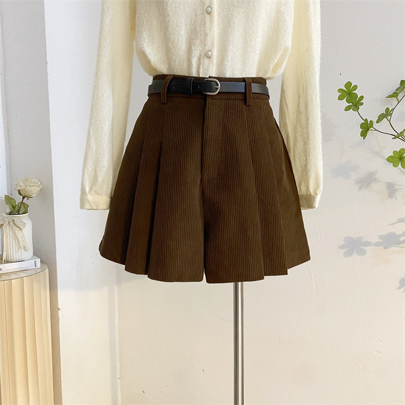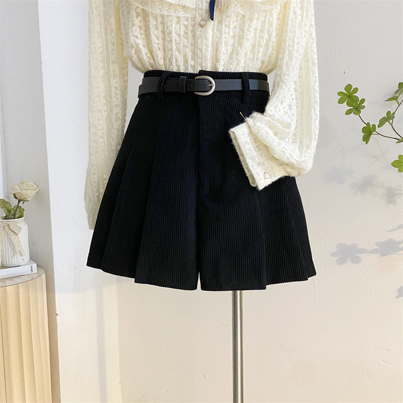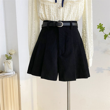 复古灯芯绒短裤女秋冬高腰a字阔腿裤显瘦百褶裙裤防走光腰带裤裙