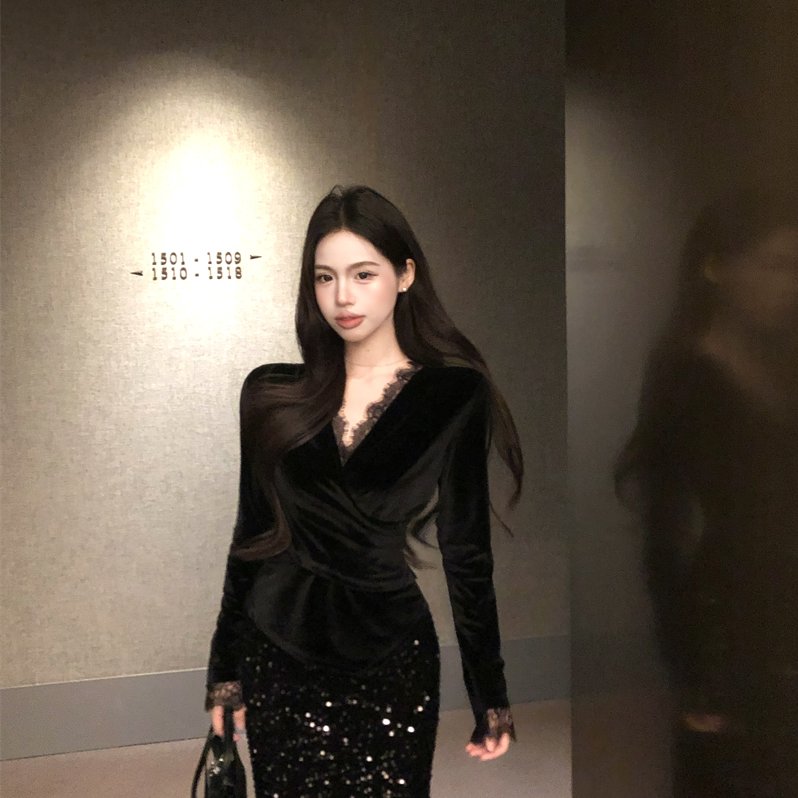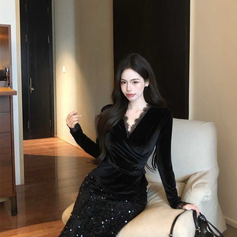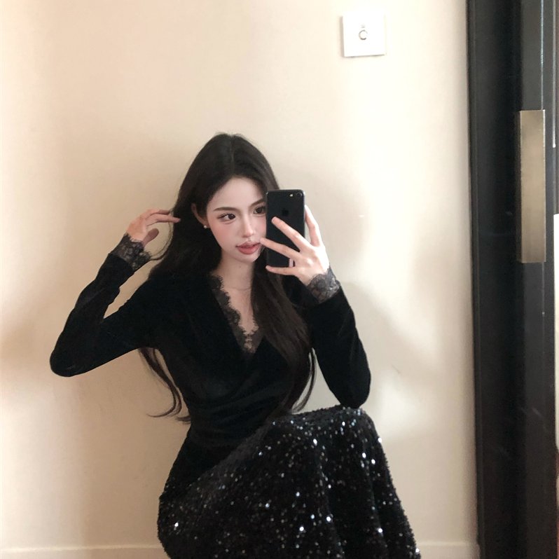 实拍实价黑色丝绒v领蕾丝边短上衣女秋冬长袖打底衫亮片半身裙套