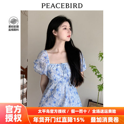 太平鸟 海风特调收腰方领连衣裙盐缩浪漫一字肩两穿裙子女度假风