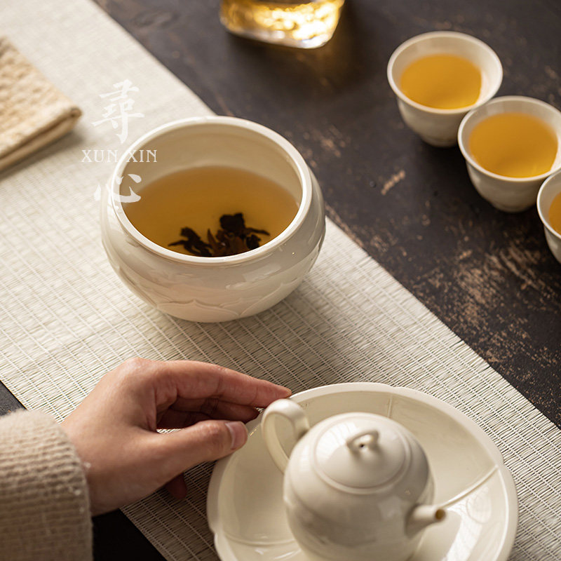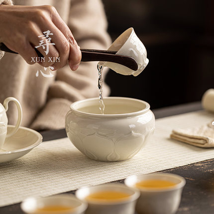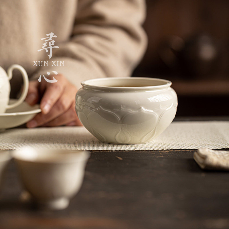 寻心定窑白浮雕复古茶洗陶瓷茶渣缸水家用盖碗茶壶废水缸建水茶道