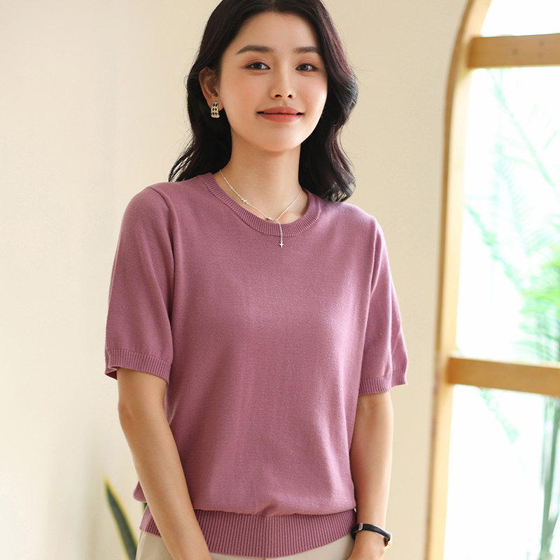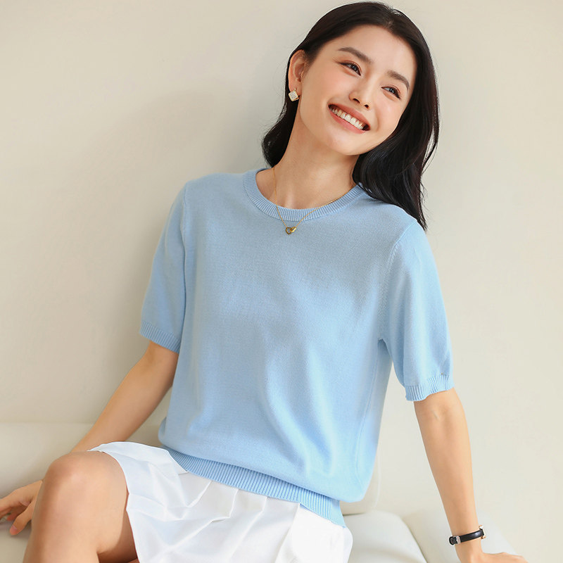 2025春夏新款100%纯棉针织短袖女士全面吸汗T恤圆领套头体恤上衣