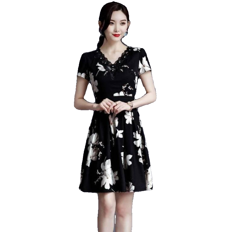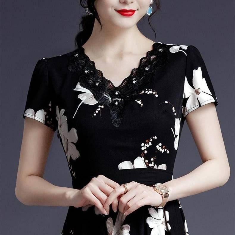 夏季新款中年妈妈雪纺收腰显瘦优雅连衣裙V领气质短袖大码韩版