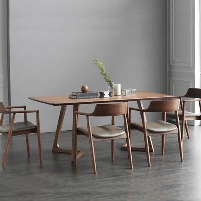 7W纯实木餐桌家用现代简约轻奢长方形书桌胡桃色洽谈茶桌广岛椅组