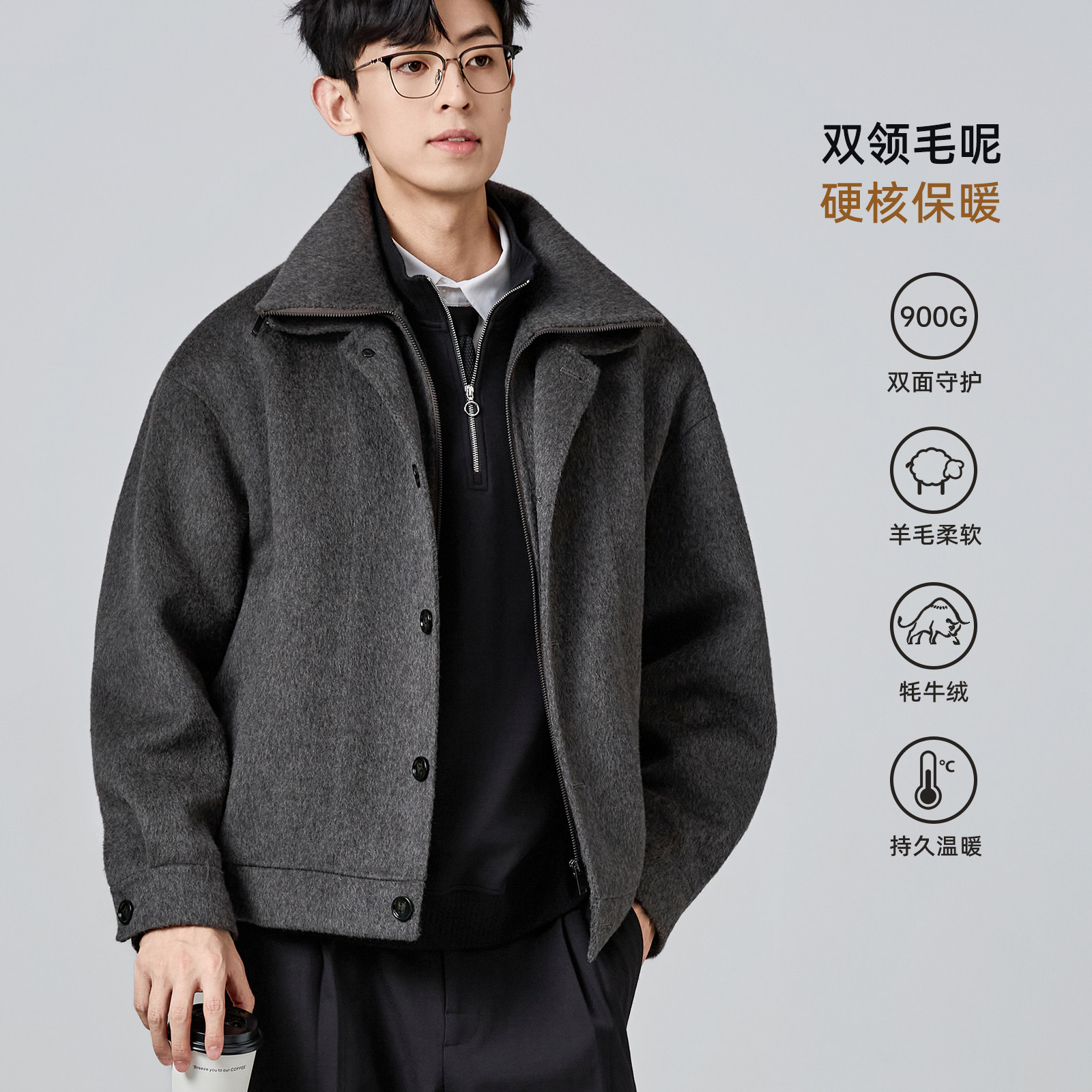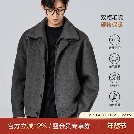 海上公路拉链双领毛呢夹克男士秋冬双门襟设计通勤双面呢羊毛外套