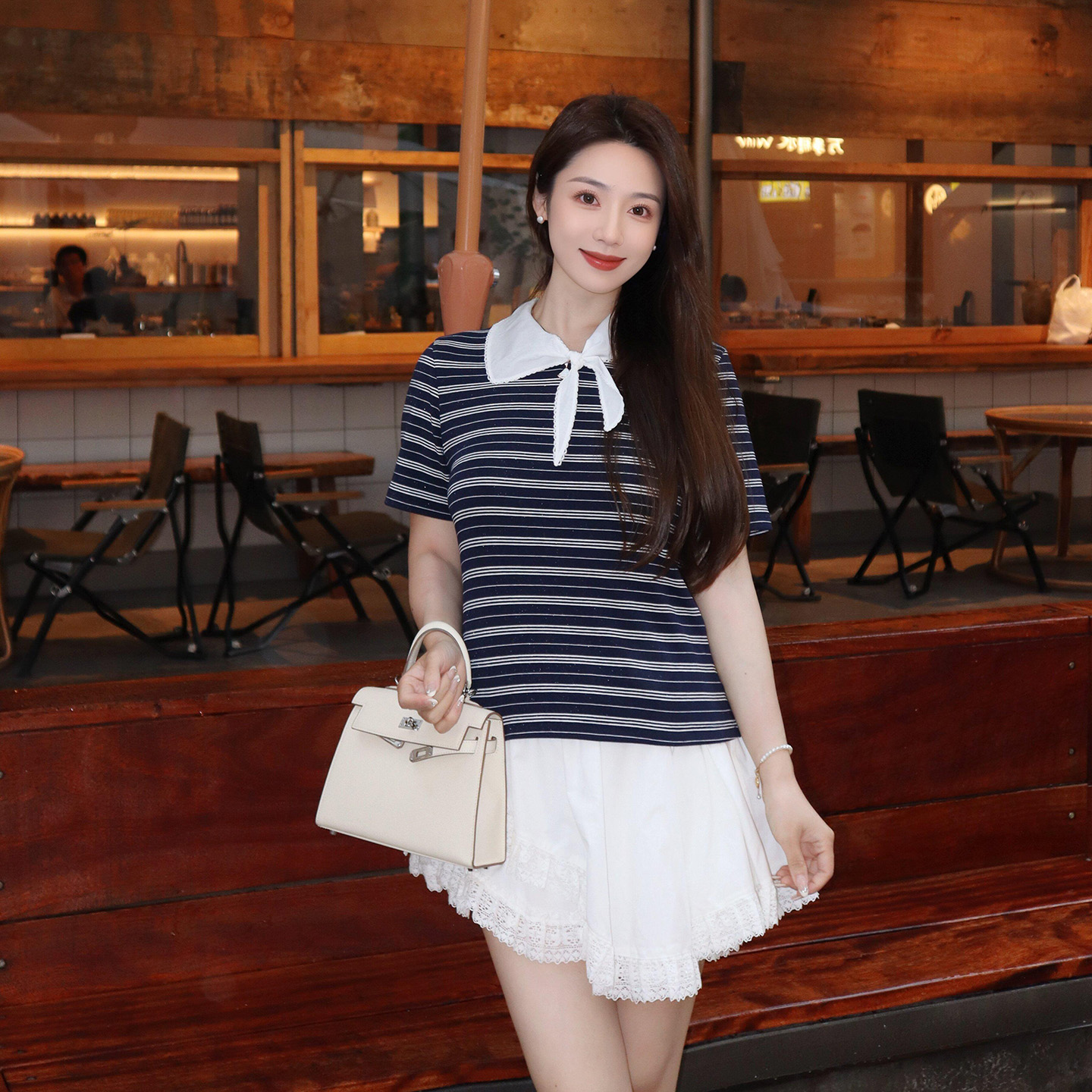 HERLIAN 2025夏季新品女士领口系带蝴蝶结短袖条纹针织衫T恤上衣