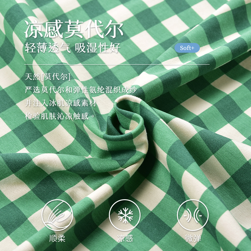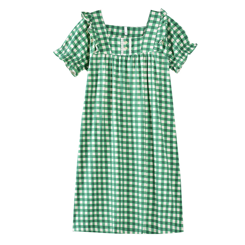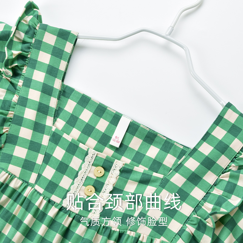 莫代尔棉睡裙女夏季睡衣2025新款短袖格子大码绿色宽松孕妇连衣裙