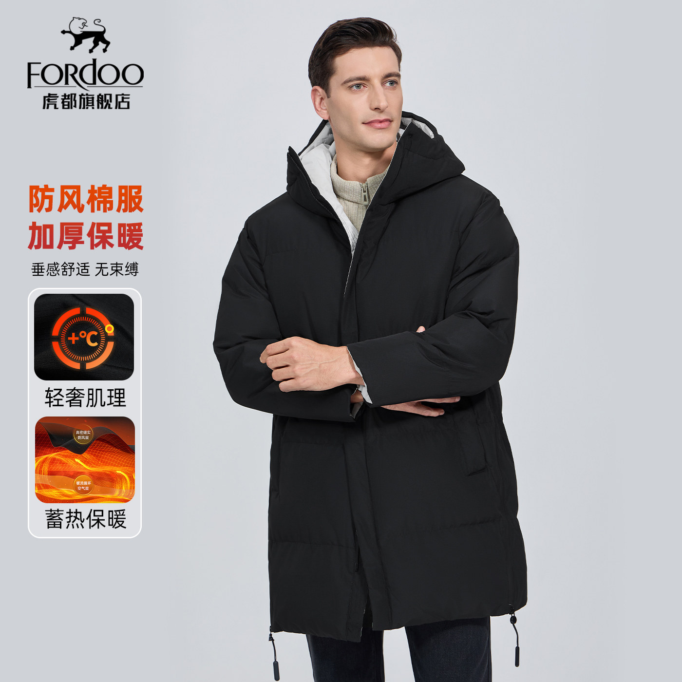 【中长款连帽棉衣】虎都冬季男式加绒加厚保暖通勤棉衣可拆卸帽子