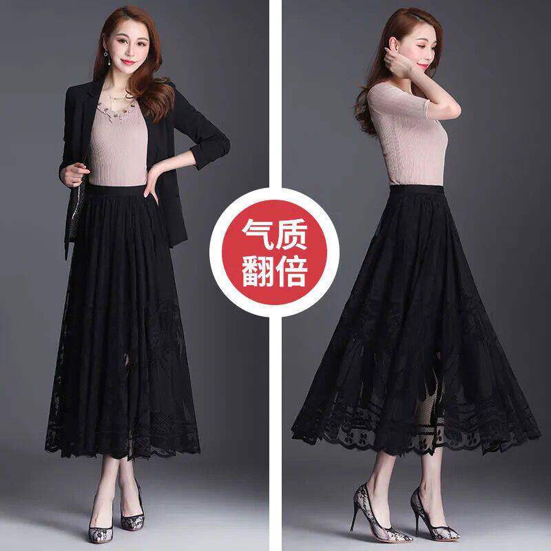 蕾丝边长款半身裙胖mm今年流行大码显瘦a字大摆网纱仙女百褶裙女