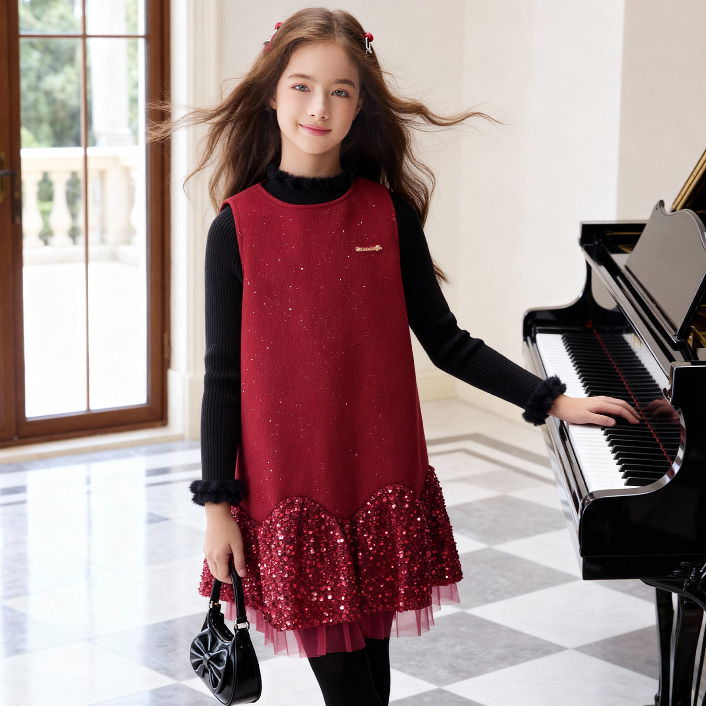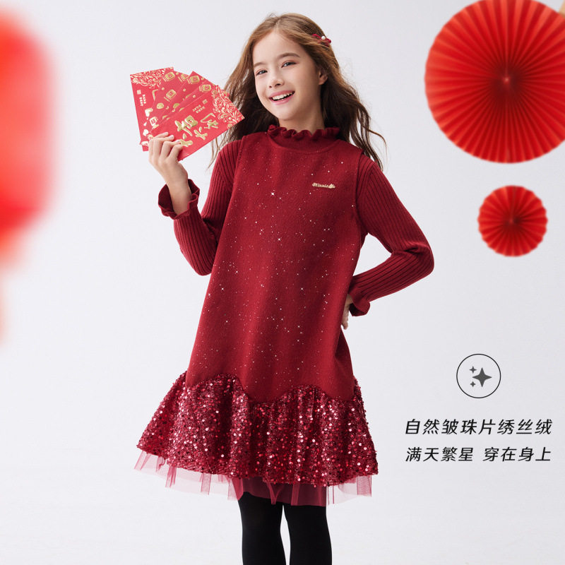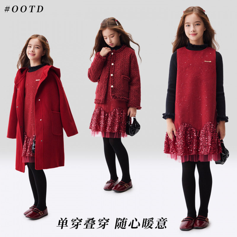 女童红色连衣裙冬装新款儿童背心裙直筒裙中大童新年装亲子拜年服