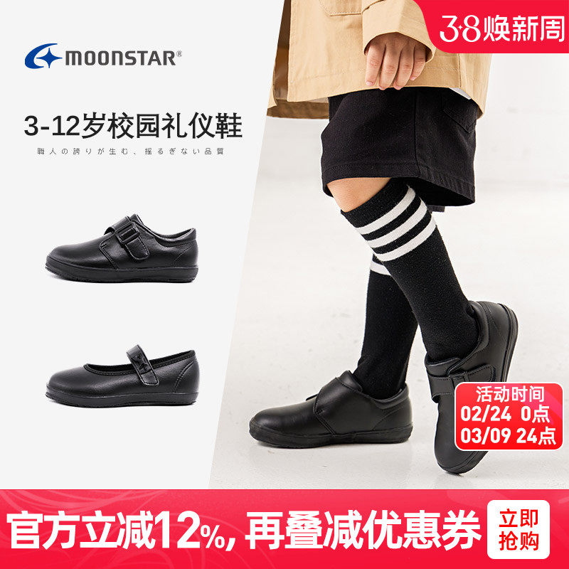 Moonstar月星3-12岁校园演出鞋黑色礼仪鞋男女童皮鞋小黑鞋机能鞋