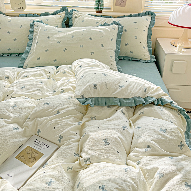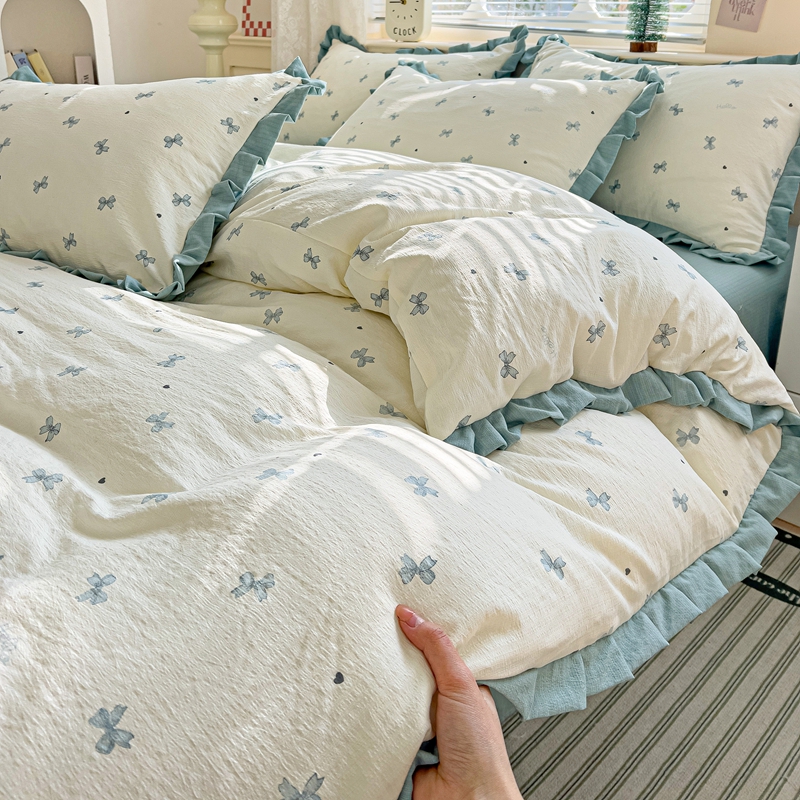 韩版蝴蝶结双层纱床上四件套春夏新款被套宿舍床单笠三非全棉纯棉