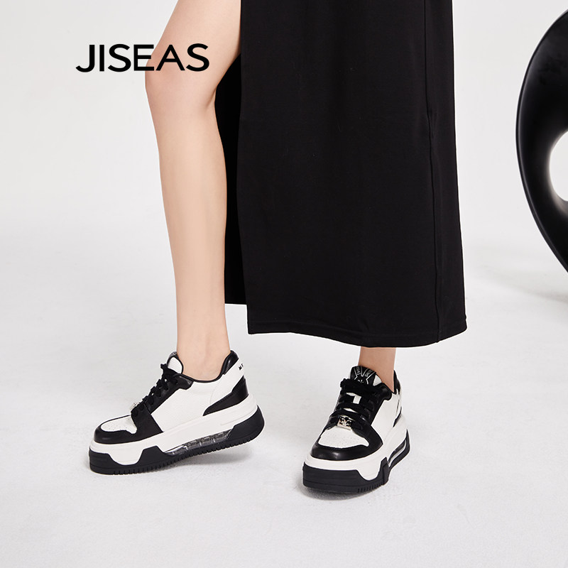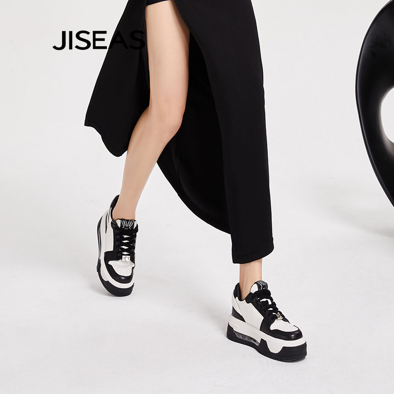 JISEAS商场同款厚底小白鞋女2024秋季新款真皮透气增高百搭休闲鞋