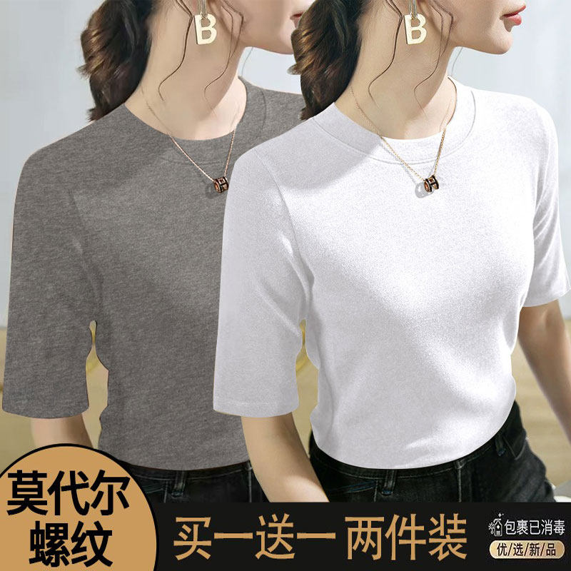 莫代尔小立领中袖打底衫女修身2025春秋季五分袖t恤百搭显瘦上衣