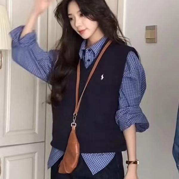 韩系时尚叠穿针织衫马甲背心毛衣女学生+蓝色格纹衬衫两件/套装潮