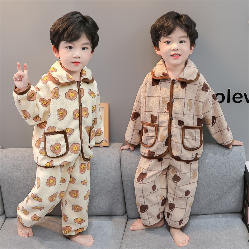 男孩睡衣法兰绒秋冬季2025加绒套装宝宝珊瑚绒新款圆领家居服
