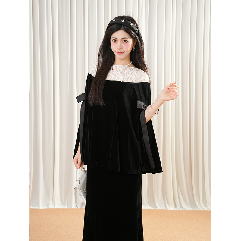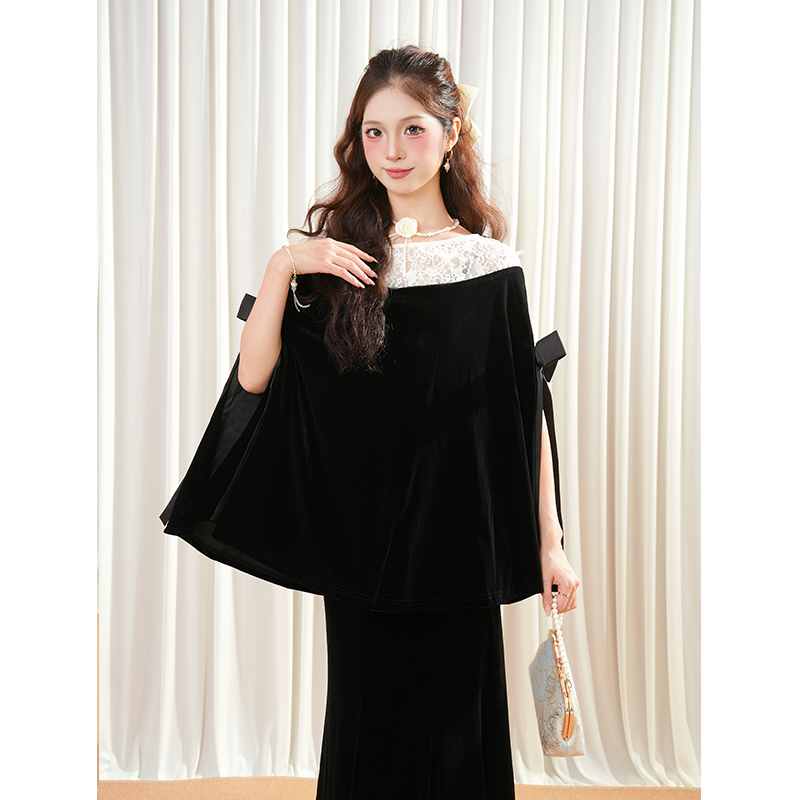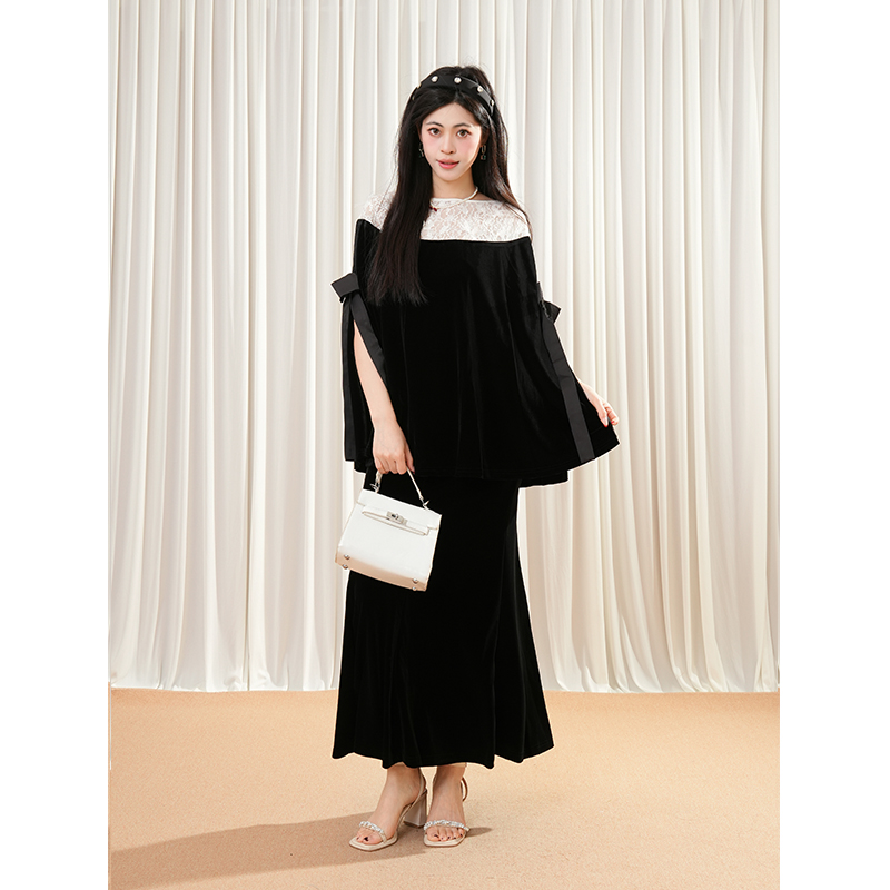 午夜山茶 仙气丝绒斗篷上衣+鱼尾半身裙套装设计感蕾丝拼接两件套