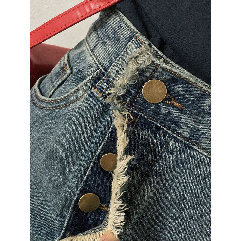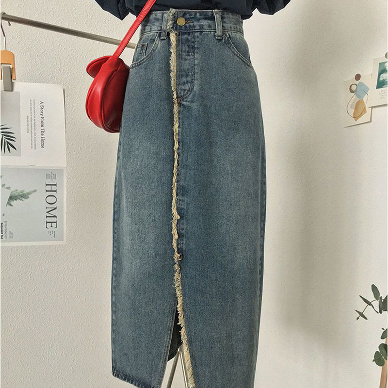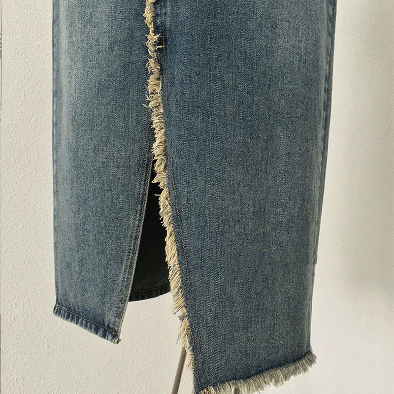 特大码300斤开叉牛仔半身裙女胖mm松紧腰显瘦不规则毛边a字中长裙